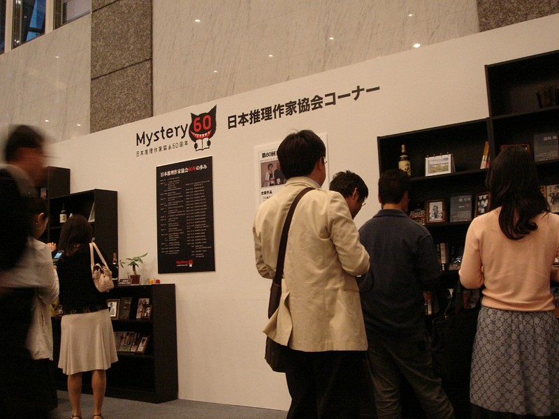 会場外のホワイエには、今回「謎」ブレンダーに挑戦する人気ミステリー作家の本コーナーが並ぶ。