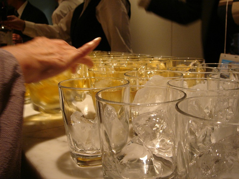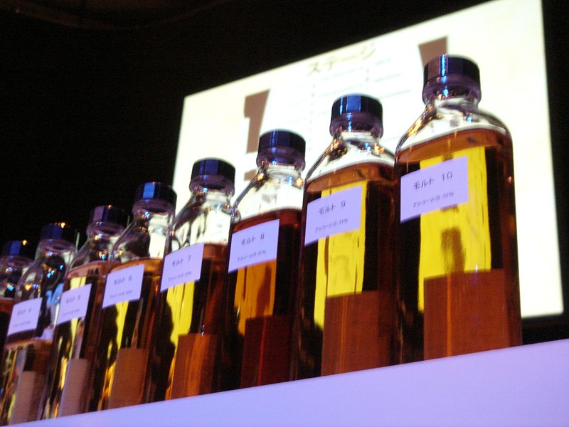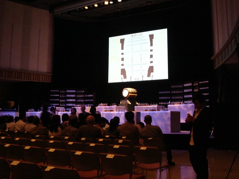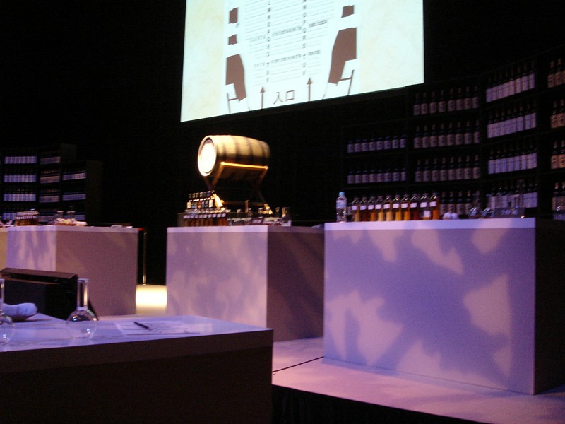 会場は広く、舞台には白い布がかけられたテーブルが並び、それぞれのテーブルの上には、琥珀色の原酒が入った細長いボトルが10本ずつ並んでいた。