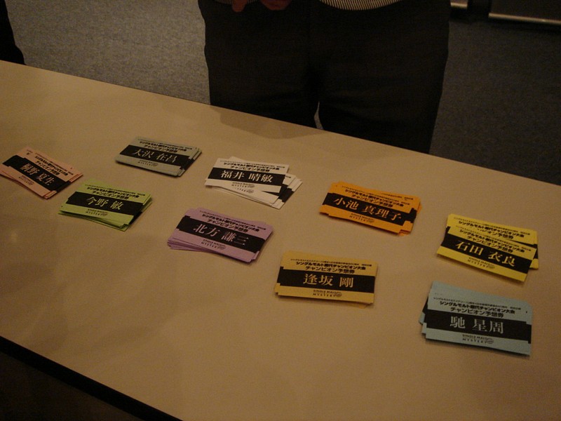 9人の先生の名前が書かれた色紙があり、前半のトークショーを受けて「この人がきっとチャンピオン」という人の名前が書かれた紙と「引き換え券」を引き換える。