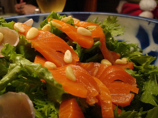 わさび菜も入ったサラダは、ドレッシングが最高においしく、一人でばくばく食べてしまった。あの味は忘れない。