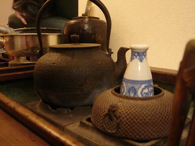 鉄瓶ではお湯が湯気をはき、隣では熱燗。