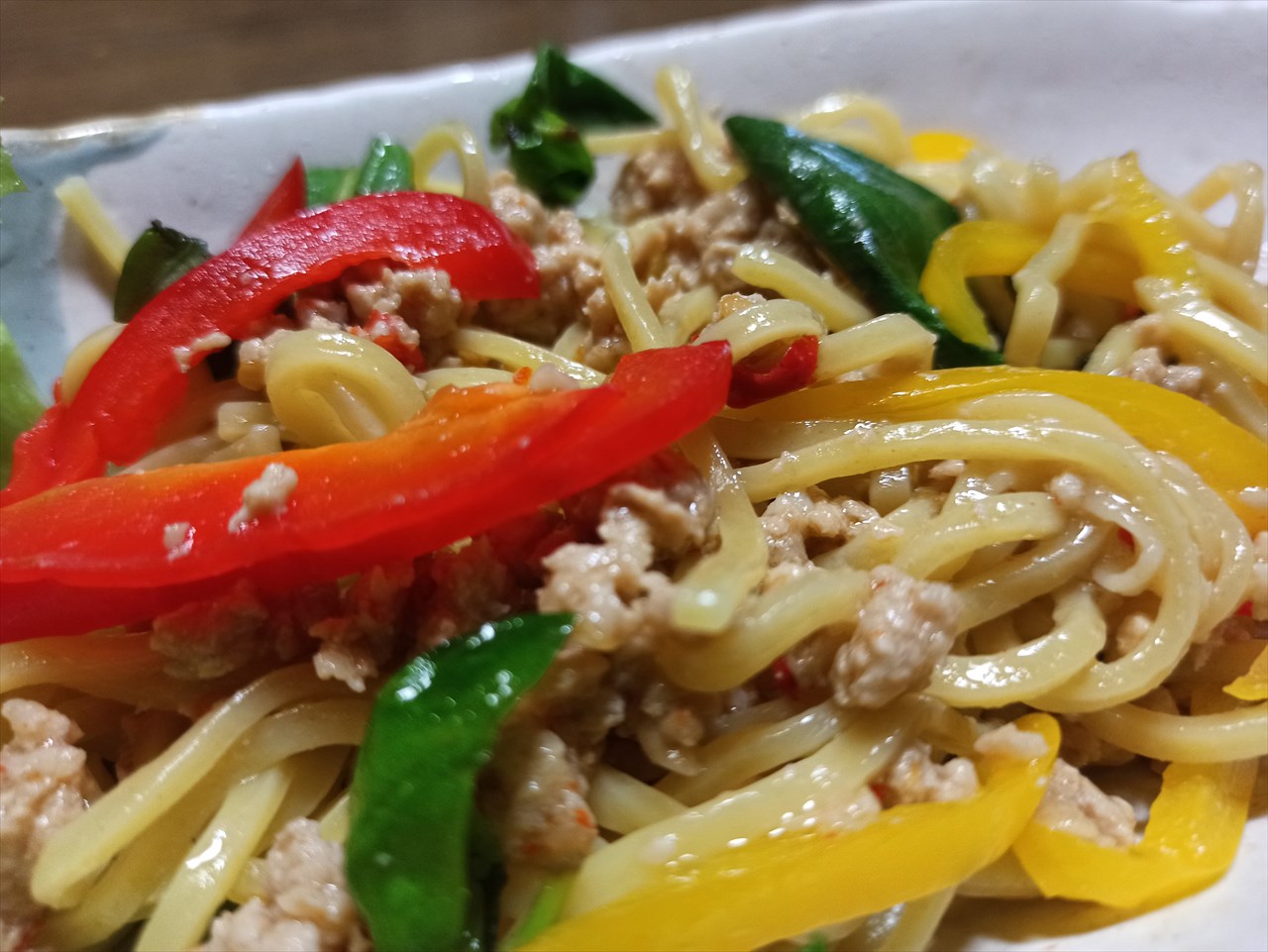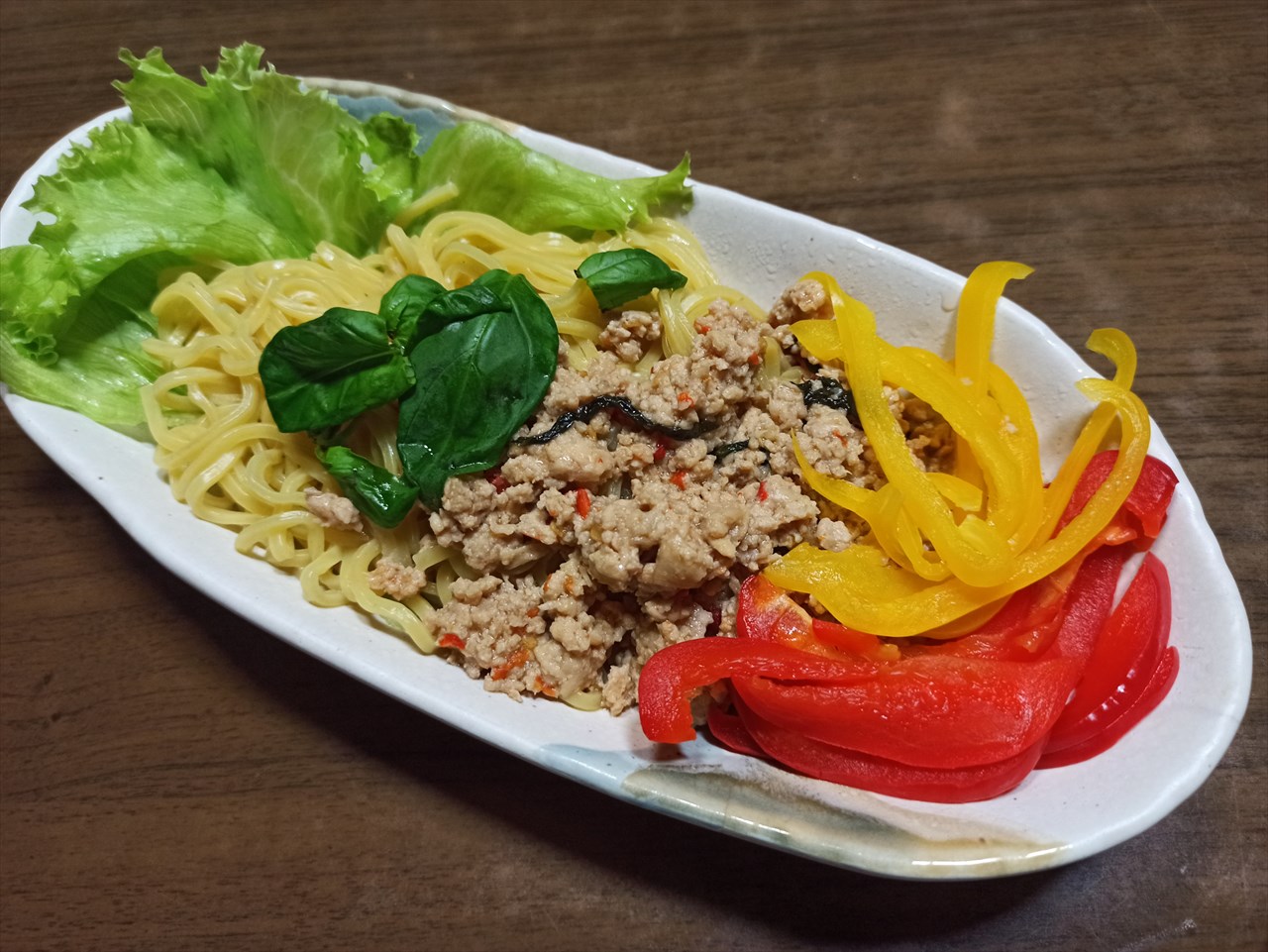 タイ料理に対して自分が抱いているイメージは「カラフル」なので、今回は赤と黄色のパプリカを茹でて添えてみた。パプリカの甘さがガパオライスの素の辛さとも合うかなと思って。