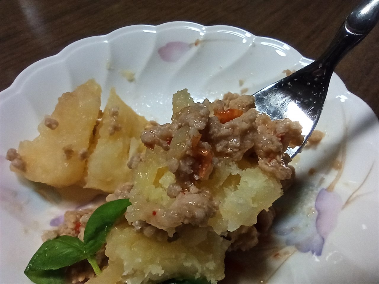 スプーンでじゃがいもを崩しながら。