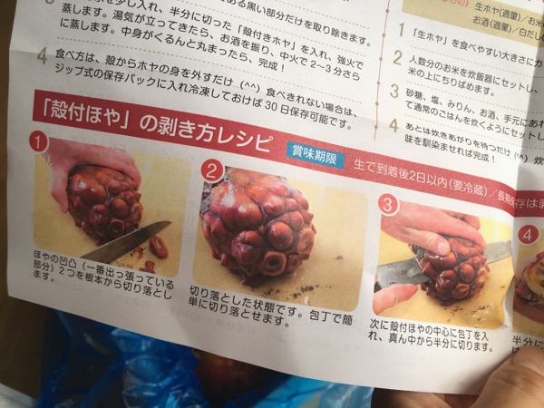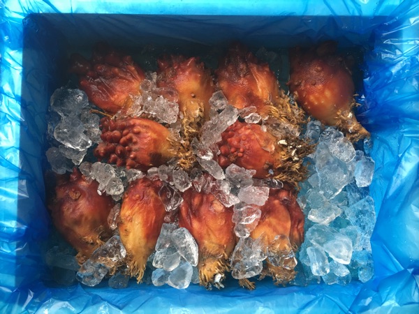 ホヤの旬は7〜8月。これは2キロでクール宅急便の送料込みで確か2,100円。ホヤ1キロ追加は450円なので送料が千円くらいだろう。