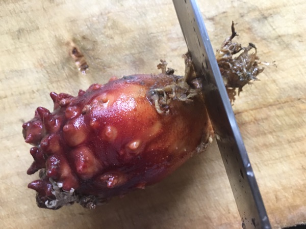 殻付きホヤ、初体験。押すとプニプニ凹み、なんともグロテスク。まずは下と頭をカット。下のヒゲ部分は問題なかったが、頭を切った瞬間、オレンジ色の液体プシューっと飛び出し、ベージュのシャツに!