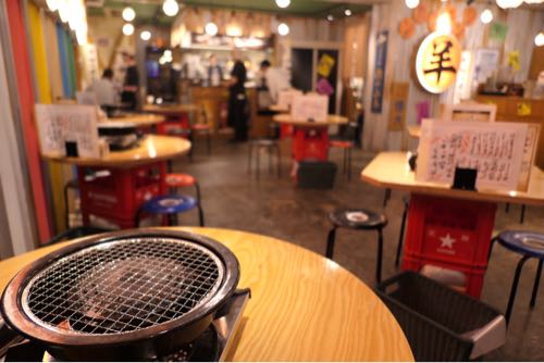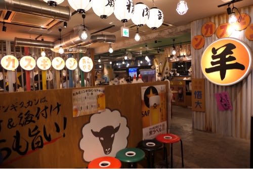 通りまで煙をもくもくと排出するビルをあがり、五階で降りると、そこは羊ワールド。昭和レトロな内装の中に「羊」の文字が浮かび上がり、至る所に羊顔マーク。