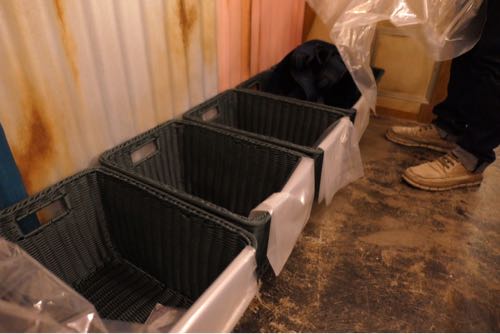 煙もくもくで鞄や上着の匂いがつくのが気になるという人のため、大きなビニールがたくさん置かれていた。