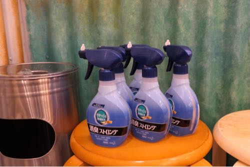 店の出口には消臭スプレー。