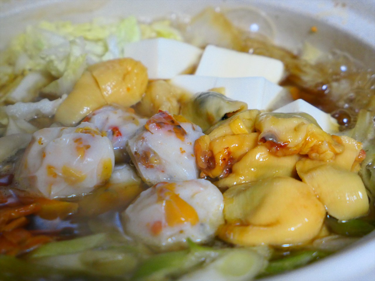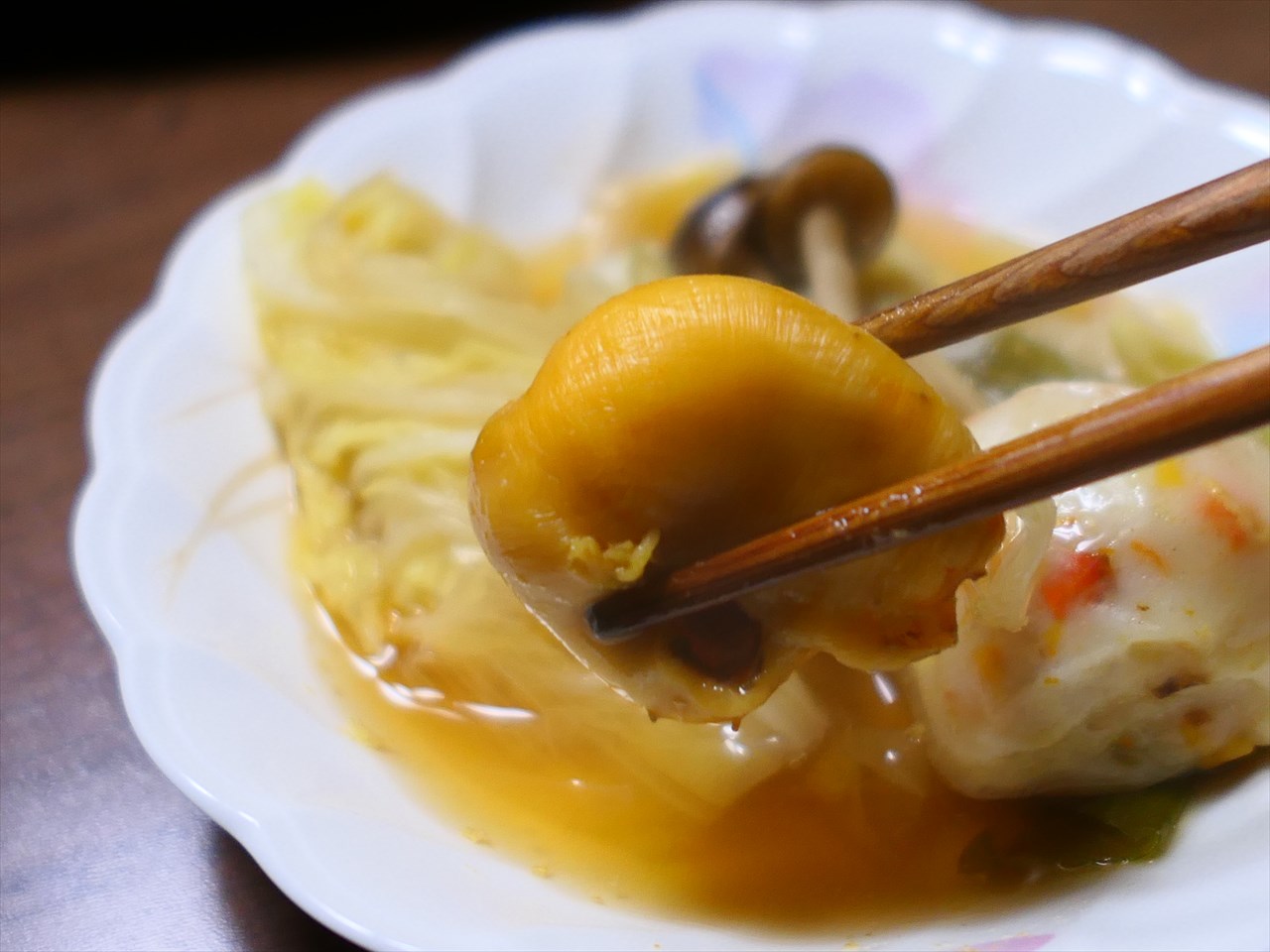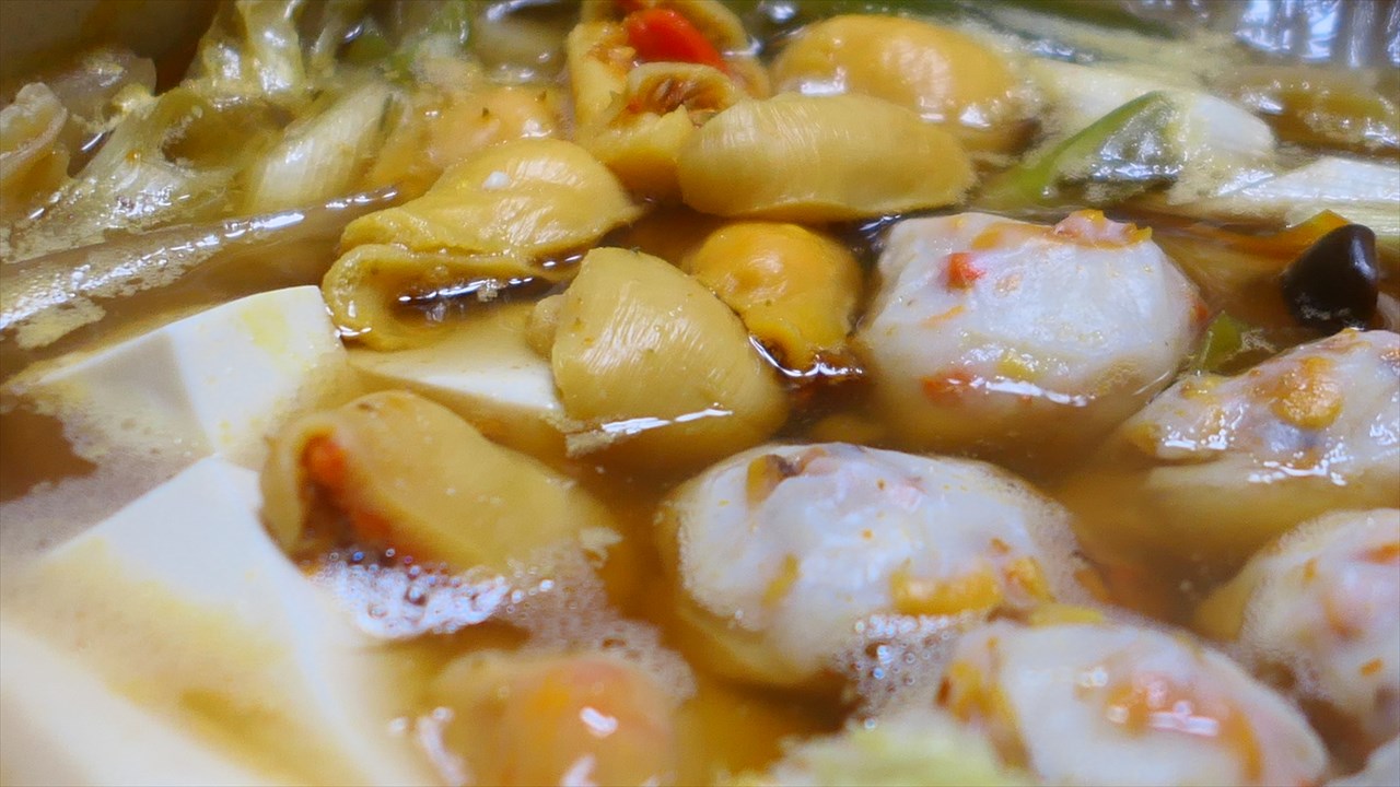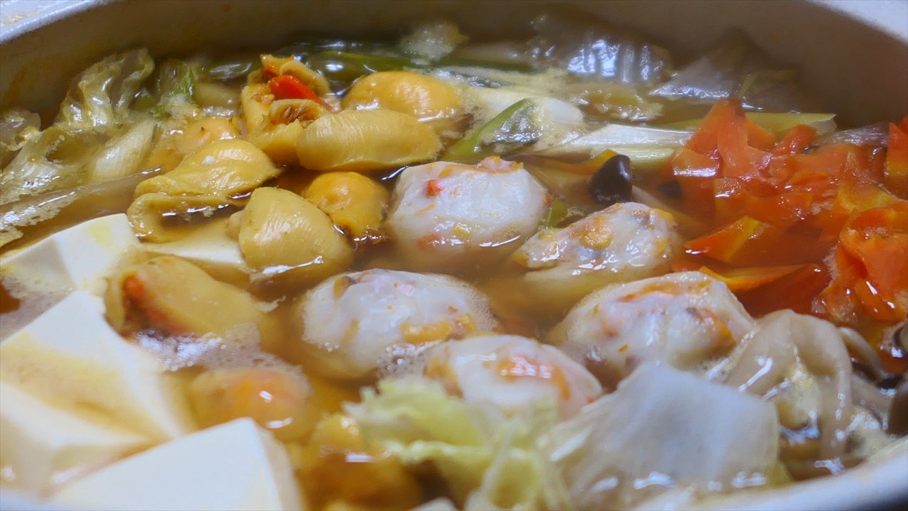 煮込んで、ホヤも鮮やかなオレンジ色から、落ち着いたクリーム色へと変化した。