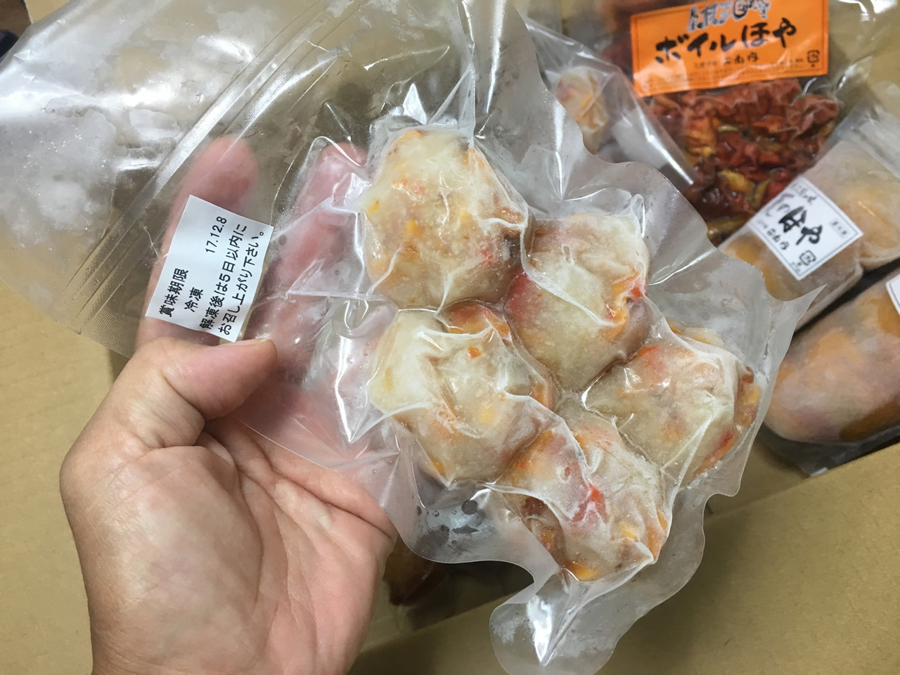 こちらはなんと赤い殻付きのまま、蒸してレトルトパックに入れて冷凍したもの。解凍するだけでいいつまみになる。