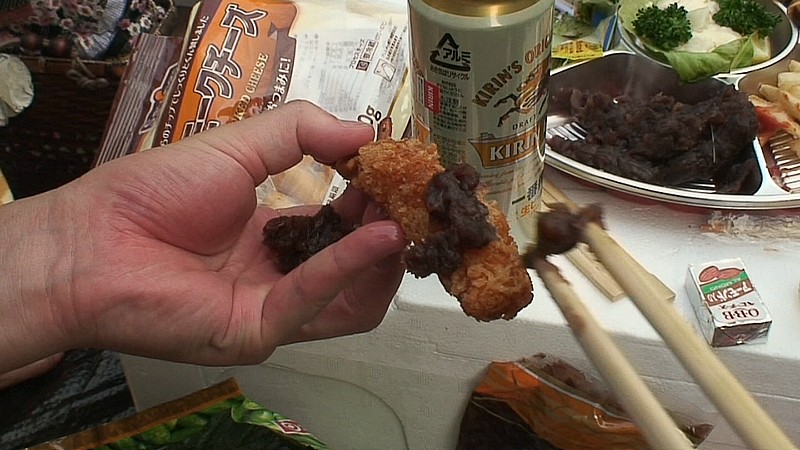 しかし、早くも手元が酔っているのか、なかなかあんこを上手にエビフライの上に乗せることができず、遂にはぽろぽろと落としてしまった。あんこを地面に落とすとは、「いろんなものにあんこを乗せて食べてみる」エバンジェリストとして、いかがなものか。