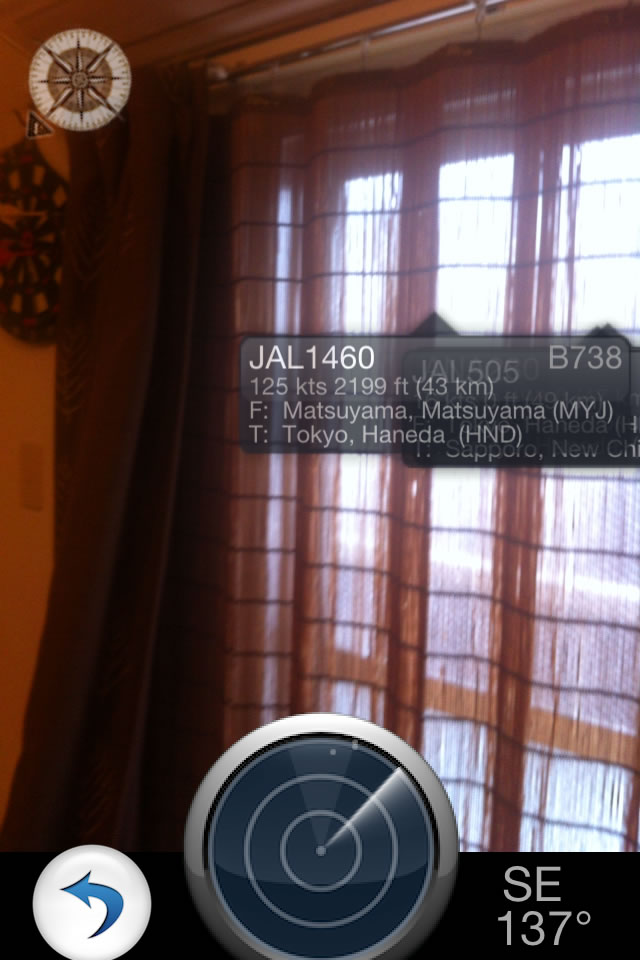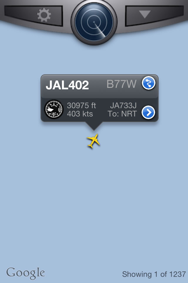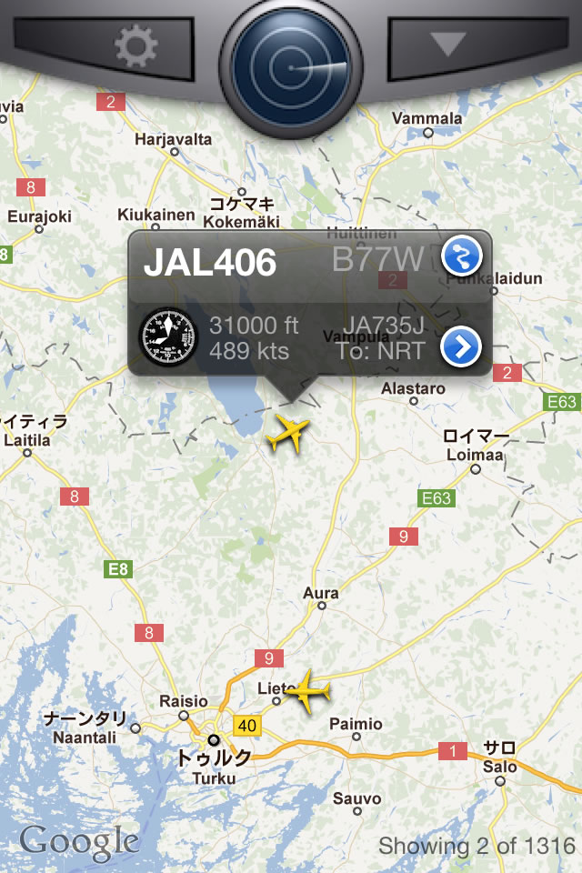 飛行機のアイコンをどれかタップすると、その機体の情報が現れる。「設定」で常に便名を表示させることもできるし、航空会社のロゴをつけることも可能。