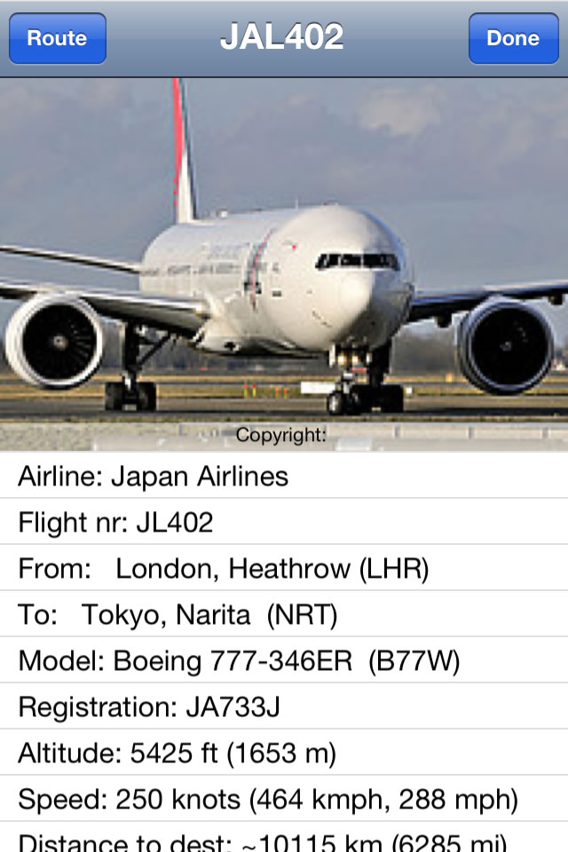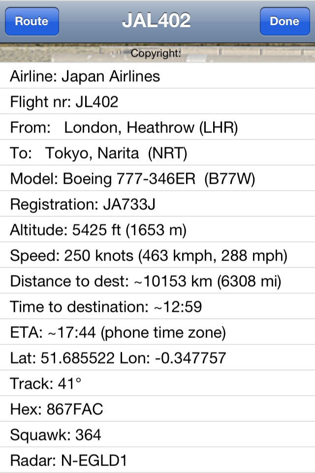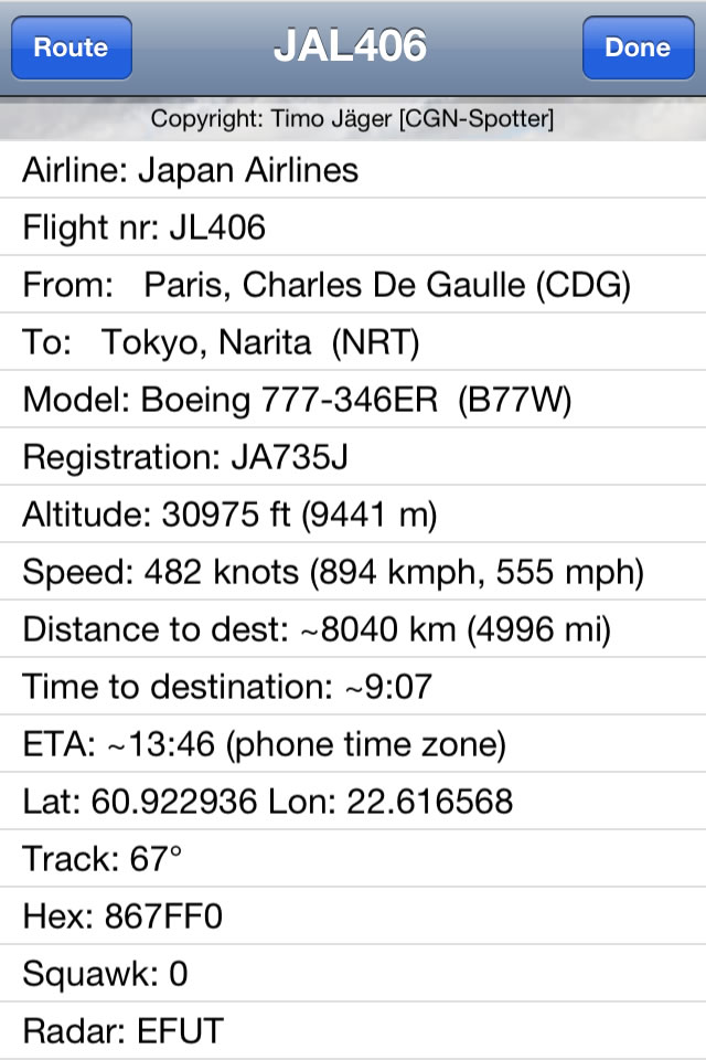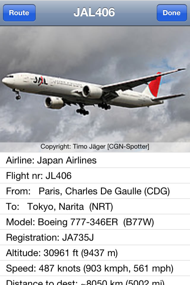 その飛行機の目的地や機体情報、現在位置・速度などに関する詳細が表示される。