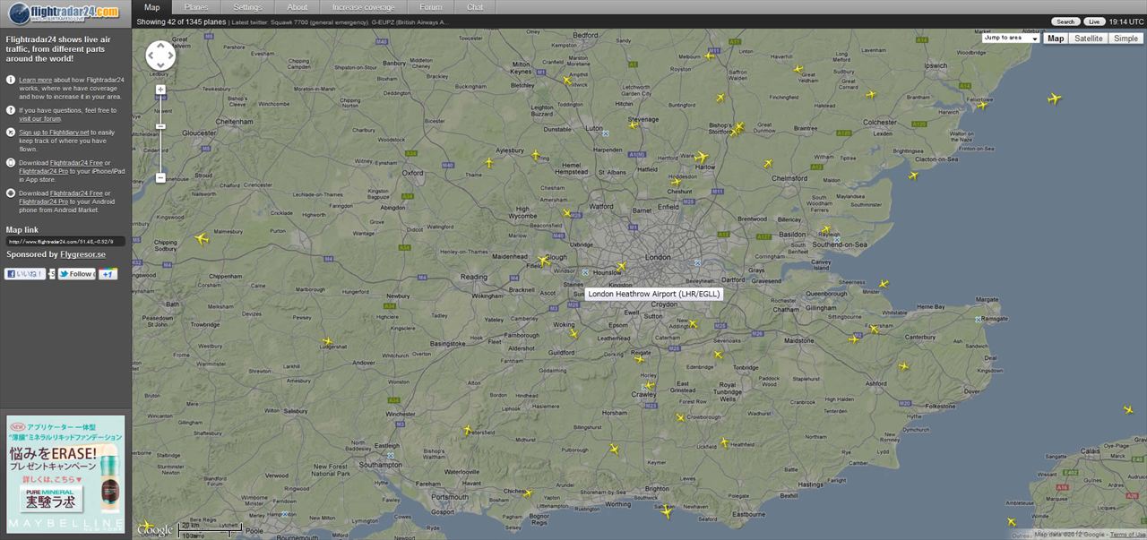 Facebookで流れていた「Flightradar24.com」が面白いのでブログでもご紹介。航空機から発信されるADS-B波のデータを集約してGoogleMapに重ねているサイトだ。