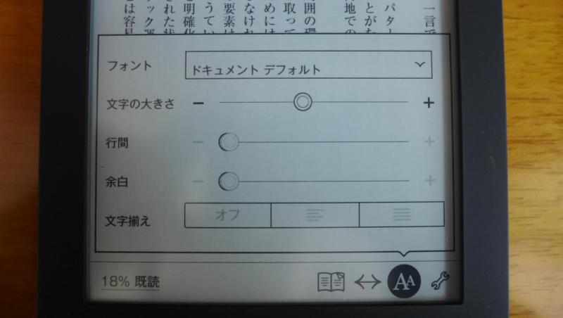 Koboに限らないが、電子書籍でうれしいのは、文字サイズを変えられること。私はあまりじっくり読む方ではなく、数行ずつがばがばっと読むタイプなので、文字はかなり大きめにしている。
