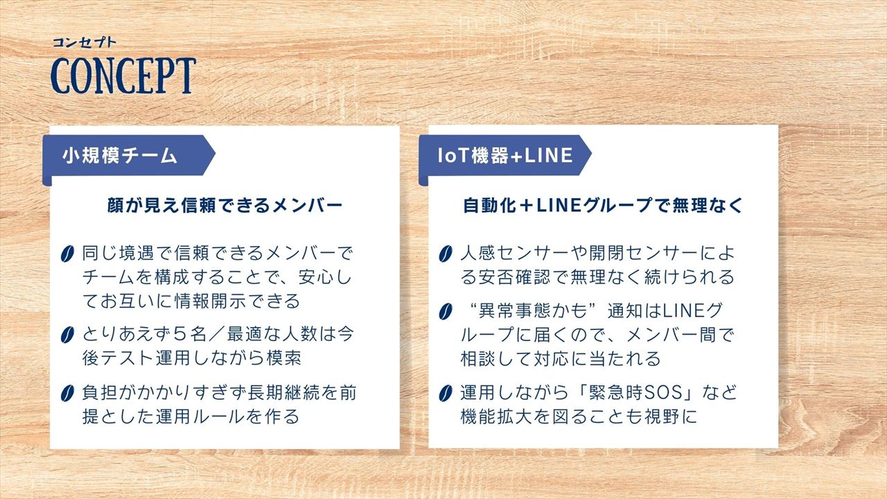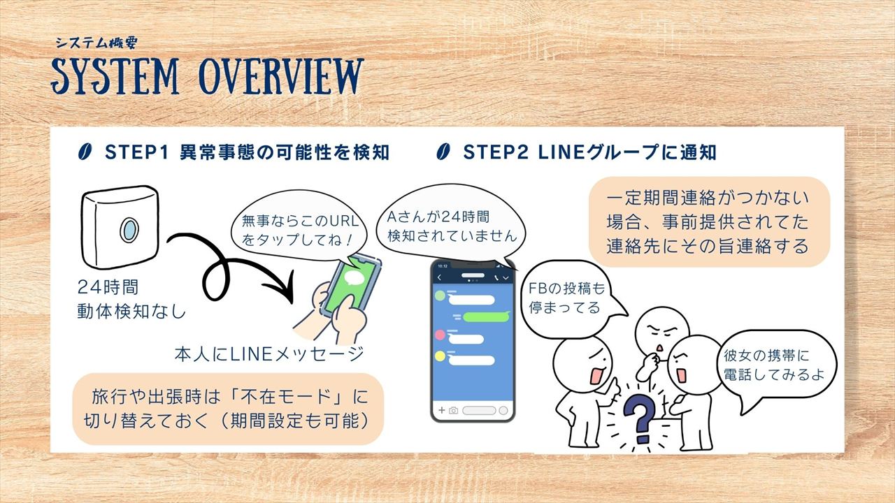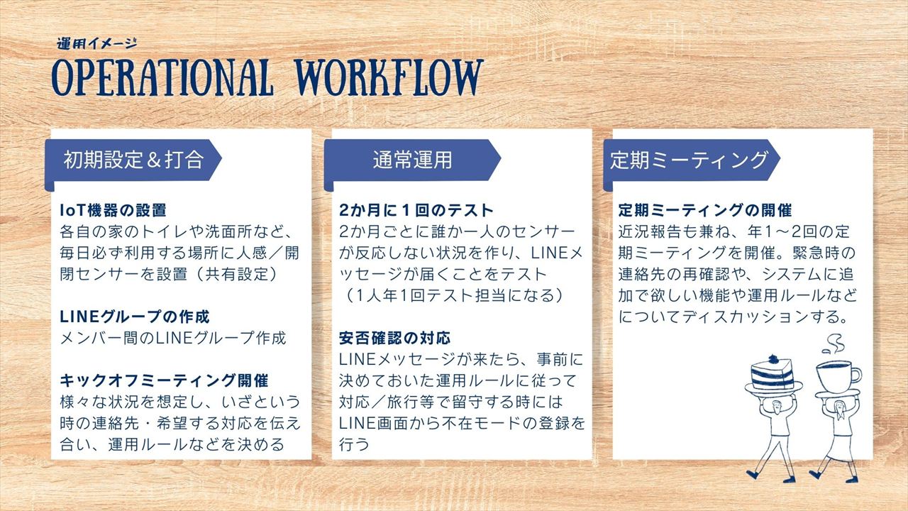 また見守りシステムというと、異常事態が検知された時には、あらかじめ登録されていた人(兄弟親戚や近所の親しい人など)に自動的に通知がいくというものを想像するかもしれませんが、実際にはその時の状況次第で最適な対処法は変わってくるでしょう。システム内に個人情報を保管することはリスクでもあります。なので、最初のキックオフミーティングの時に様々な状況を想定して各メンバーの希望を共有し、連絡先の電話番号やメールアドレスなども、個人間で交わしておくというのがいいのかなと思っています。