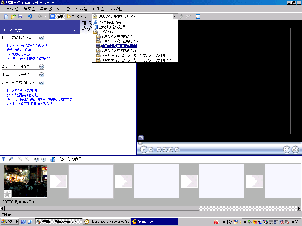 VISTA版では、確か複数のクリップがアイコンで並んでいた気がするんだけど(こんな画面)、XP版は一個ずつしかでてこなかったので、そのすぐ上のプルダウンでクリップを選択して別のを開き、同じくドラッグして、一番下の編集作業する場所に並べる。