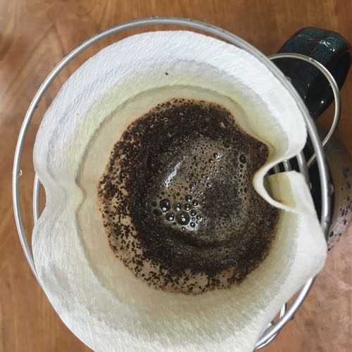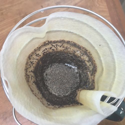 豆少なすぎなのもあるけど、多少ぶくぶくと泡だつかと思ったのであっけない。普段はプラスチックのコーヒードリッパー使ってるので、そりゃそれがなくて紙フィルターだけならこうなるよな。