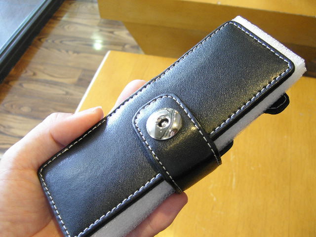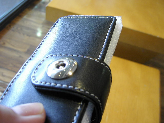 ミシンの縫い目が目立ちすぎなのがちょっと気になったけど、皮(本皮?値段的に合成皮?)の手触りはとてもよく、角とかバンド部分とか、とても丁寧に作られている感じ(5つくらい在庫があって、中にはミシンの縫い目が曲がってしまっているのもあった)