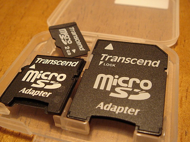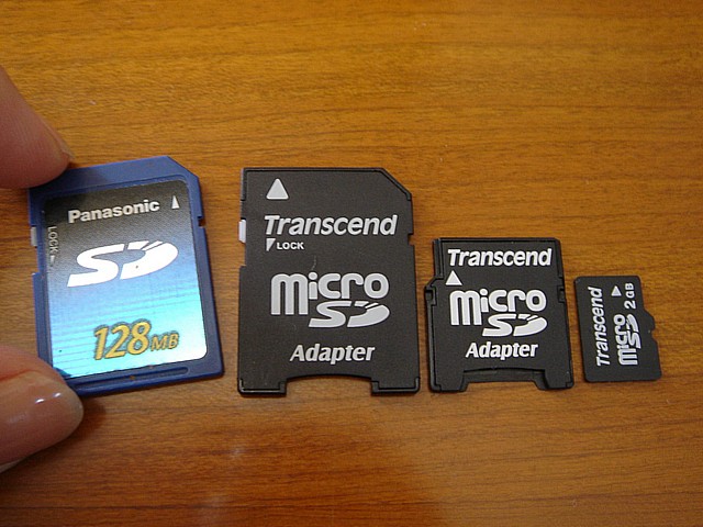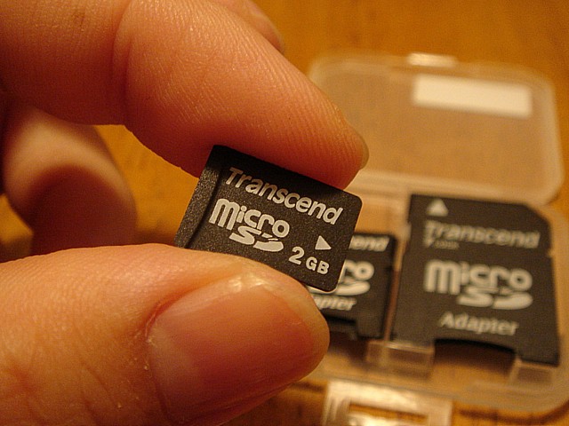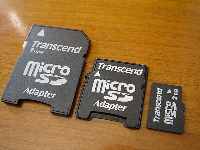 最初見た時、馬鹿みたいに「3つも入ってる!!!」と驚いてしまったのだが、もちろん手前の2つはアダプタで、単なる「抜け殻」。奥のピントがあっていない一個だけが、本物のmicroSDカードだ。