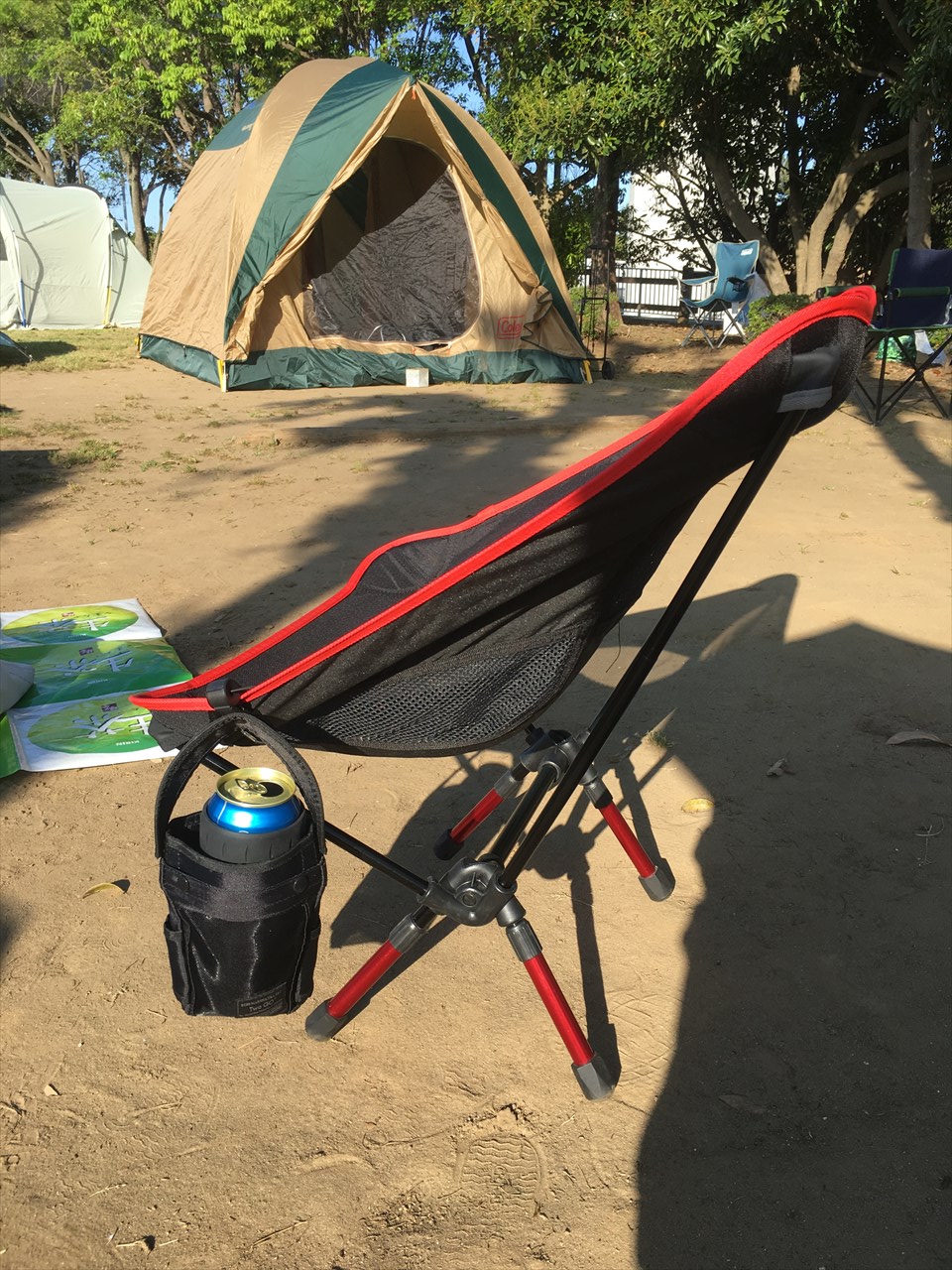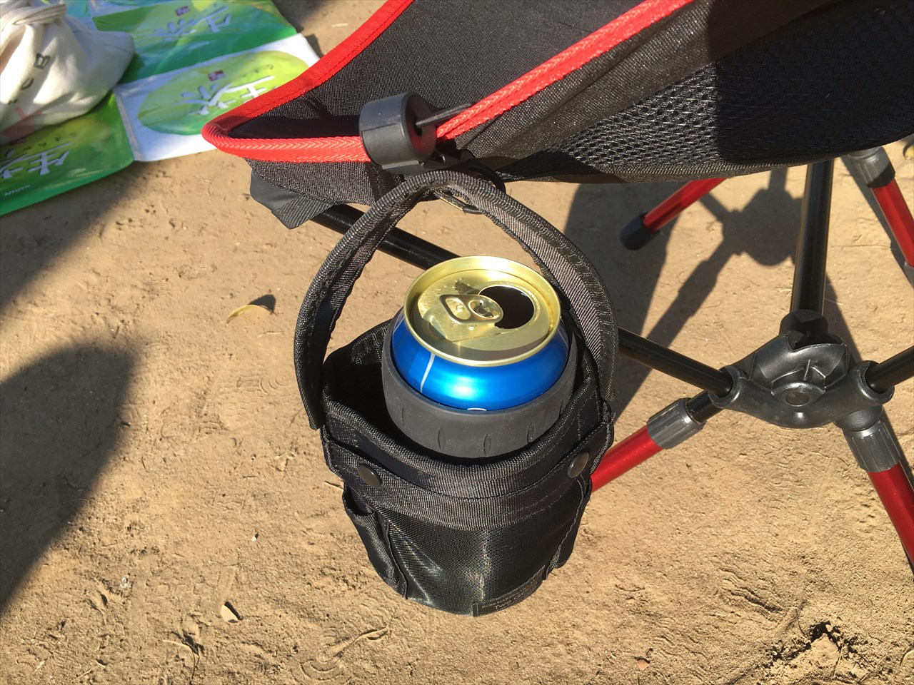 キャンプ場では、折り畳みチェアに取り付けて缶ホルダーにすることも。