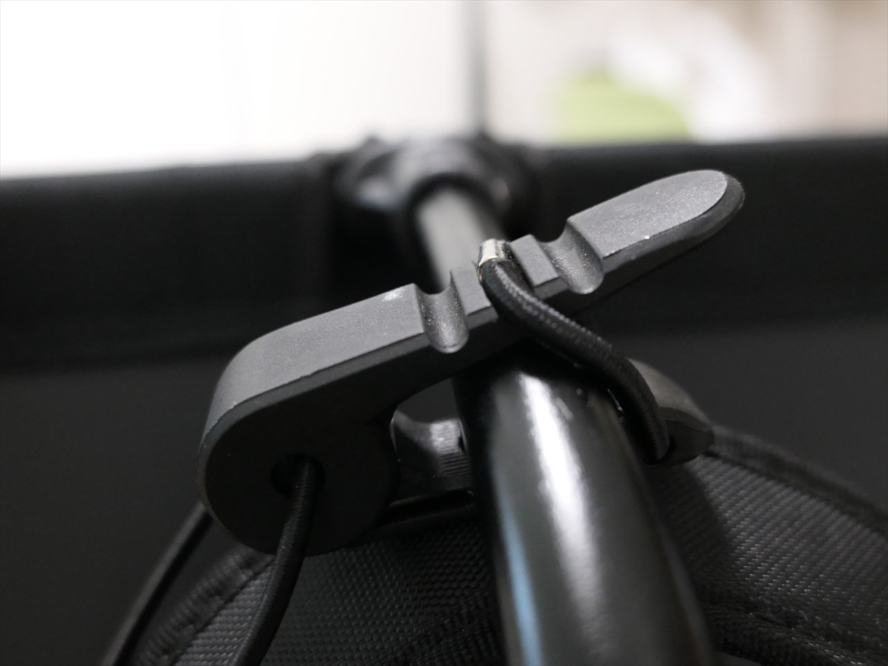 さらにゴムを溝にかけることで、万が一外れて落ちてしまうことを予防してくれる。溝も3本あるのでポールの太さなどによって場所を変えればいい。