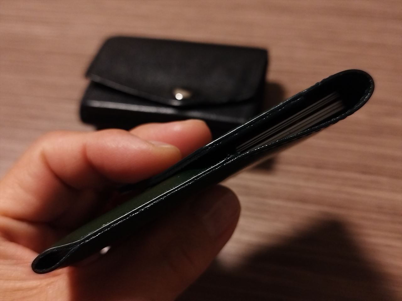 すっと柔らかい滑らかな感触で挿入され、カードケースとの間には隙間もほとんどなく、厚みもカード分が増えただけ。