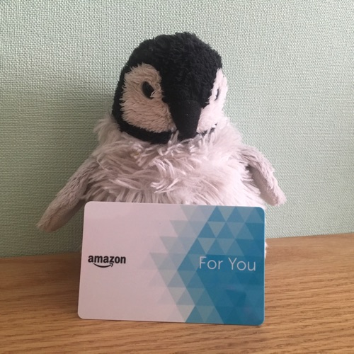 Amazonギフト券。裏面に銀色コーティングされた部分があり、そこ削ると中からギフト券番号が。Amazonサイトで打ち込むと金額分の買い物ができるようになっていた。
