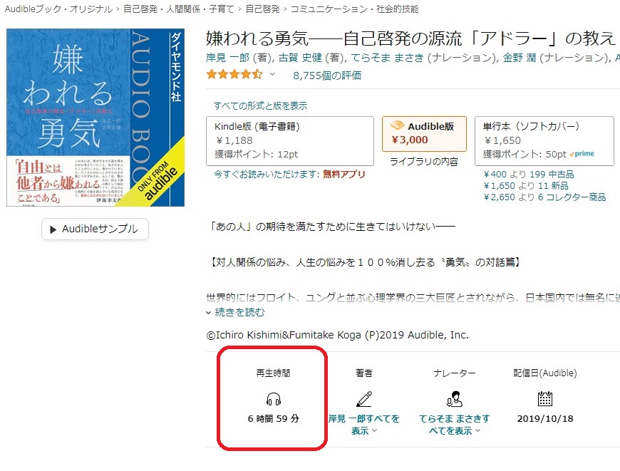 オーディオブックは一般的に、目で読む本より時間がかかります。例えばは、数年前にアドラー心理学の火付け役として話題にもなった岸見一郎著「嫌われる勇気」が296ページ。