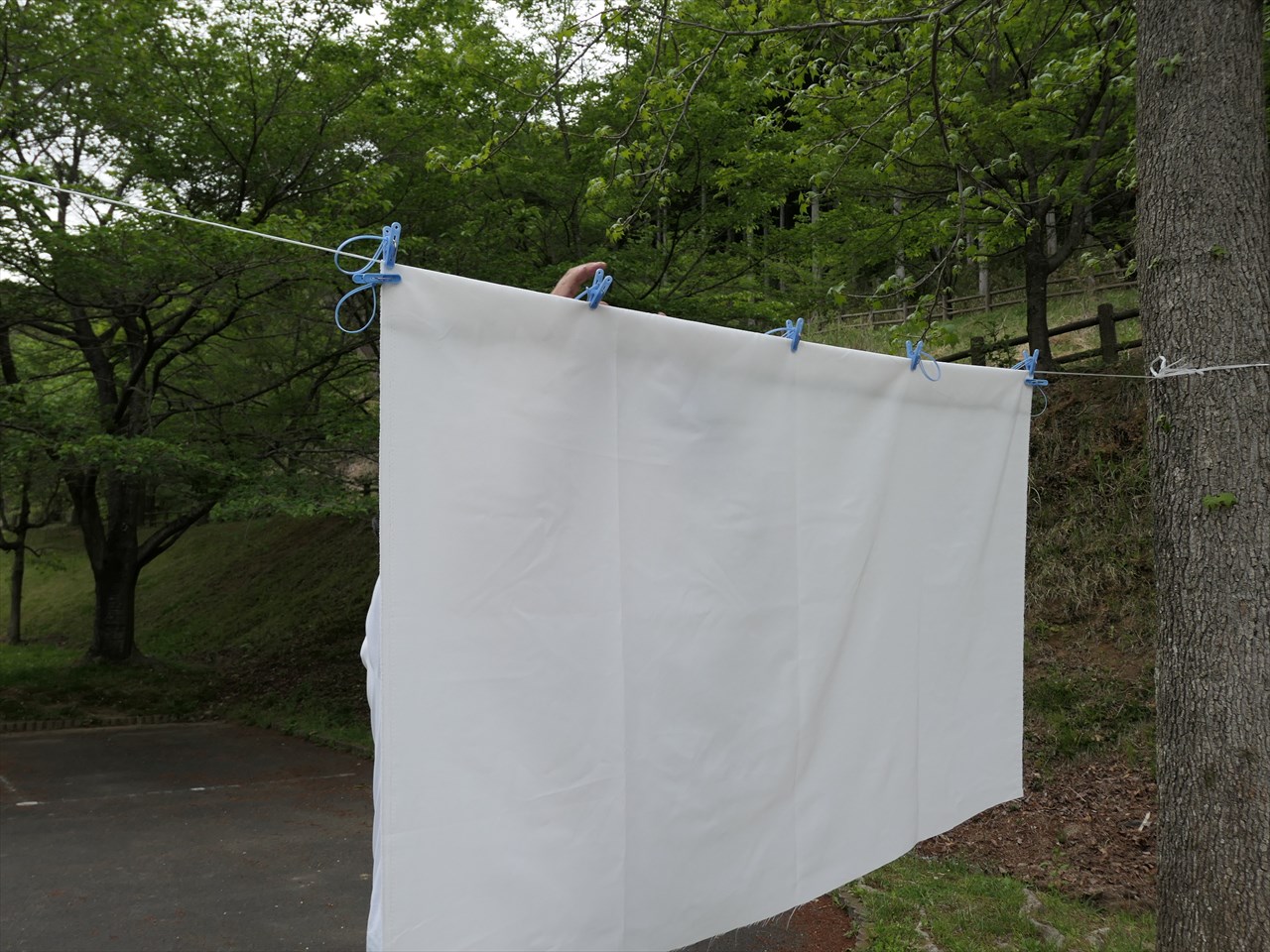 風で少しはためいてしまったので、布の下部両端に洗濯ばさみをとめロープを垂らして地面で軽く固定。