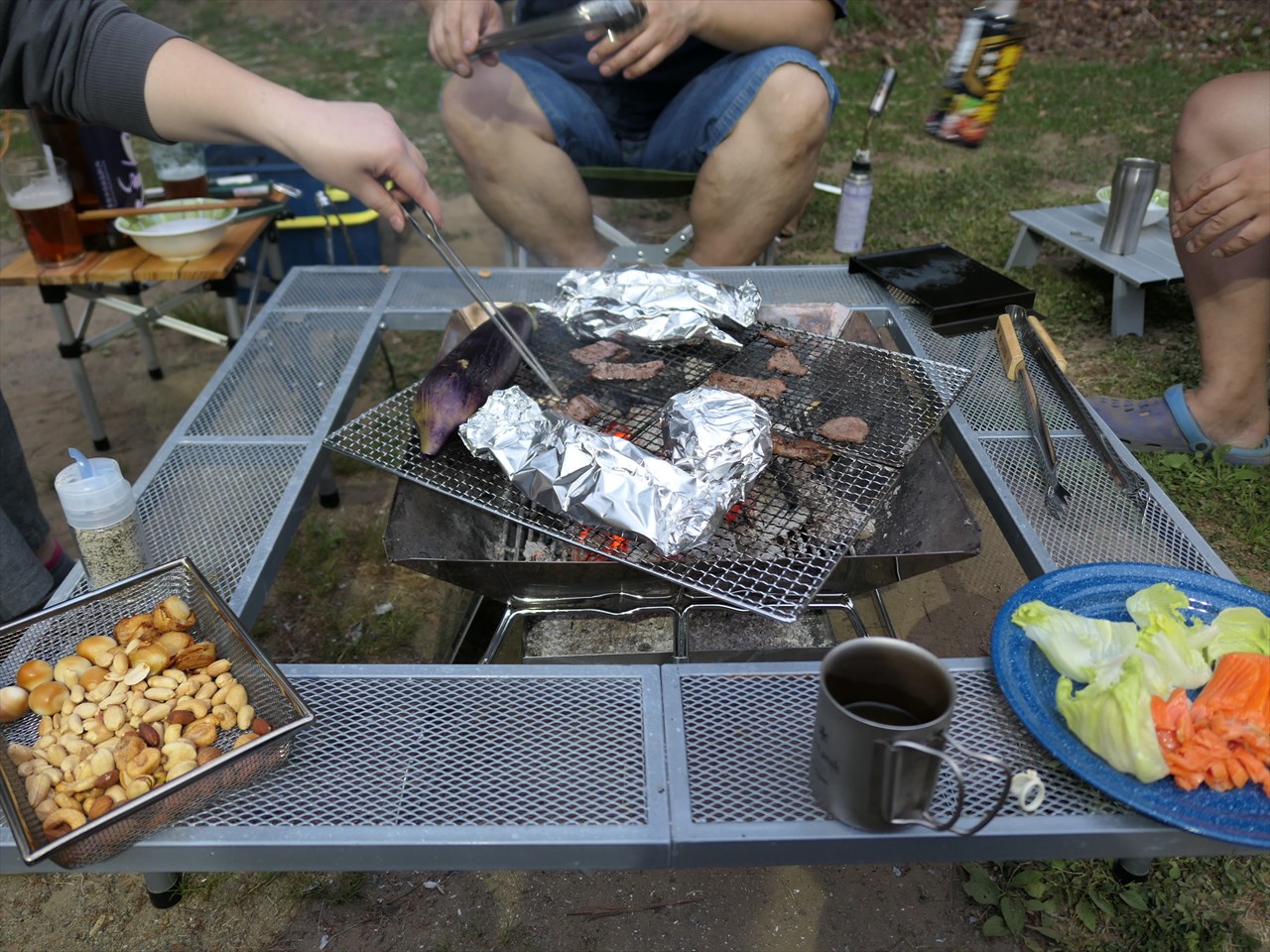 バーベキュー台の周りのチェアに腰かけ、