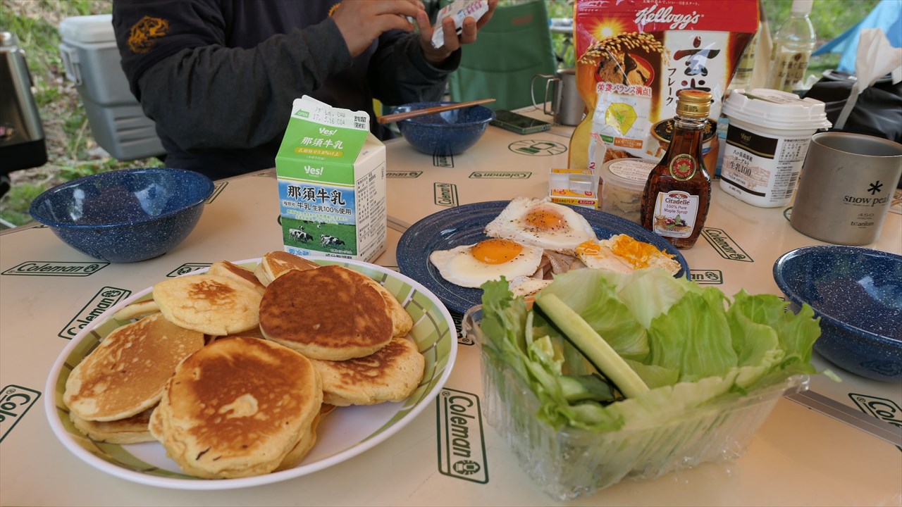 パンケーキにサラダ・目玉焼きという爽やかなキャンプ場の朝食。