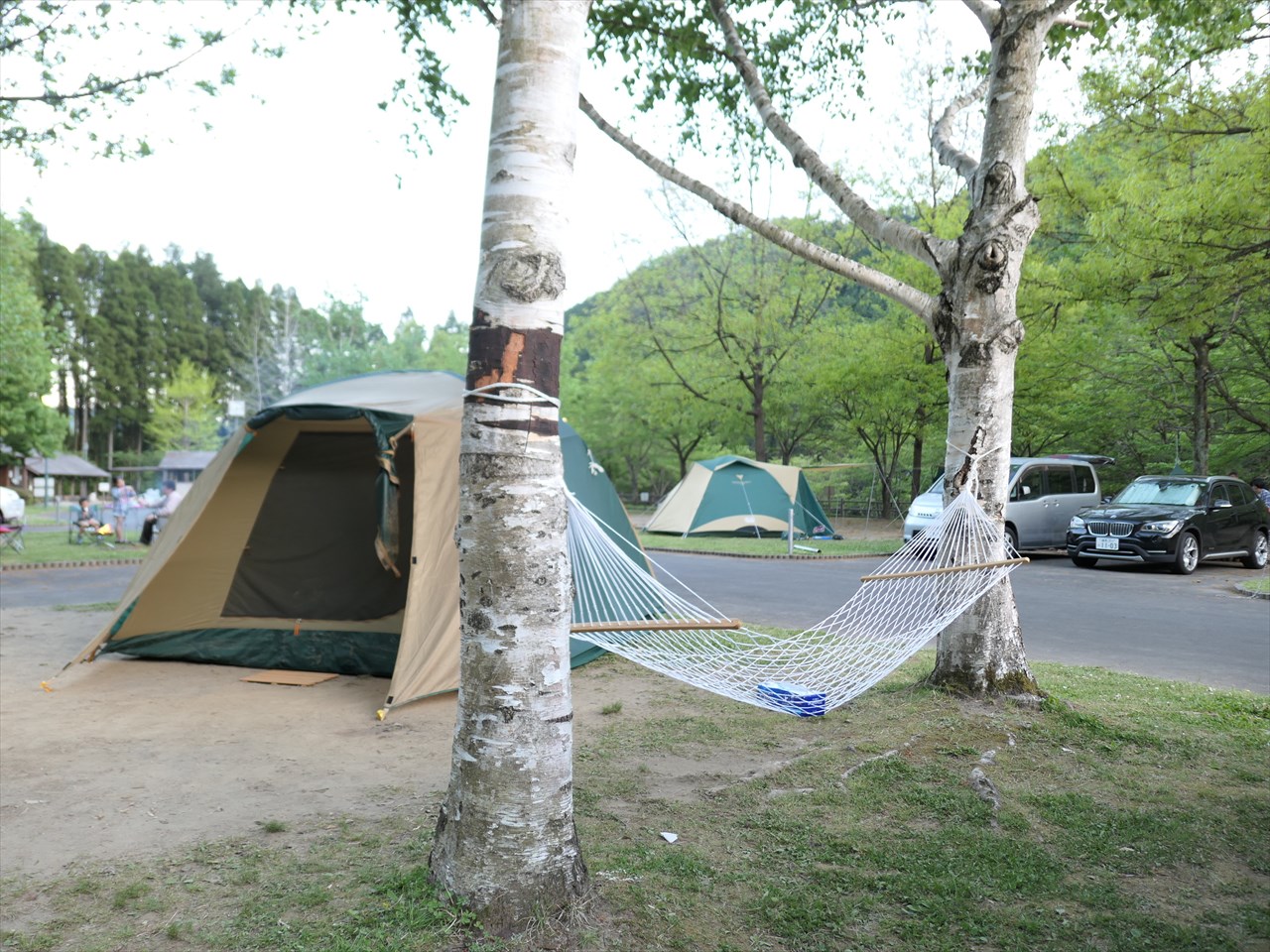 日中は日帰りバーベキュー客で賑わうが、夜は広い敷地にわずか6グループがテント泊するだけの静かでゆったりしたオートキャンプ場だった。