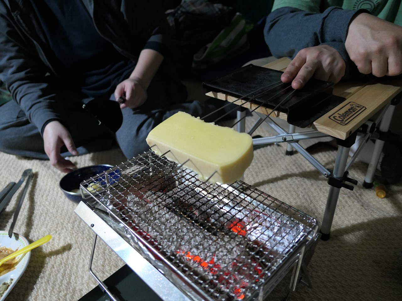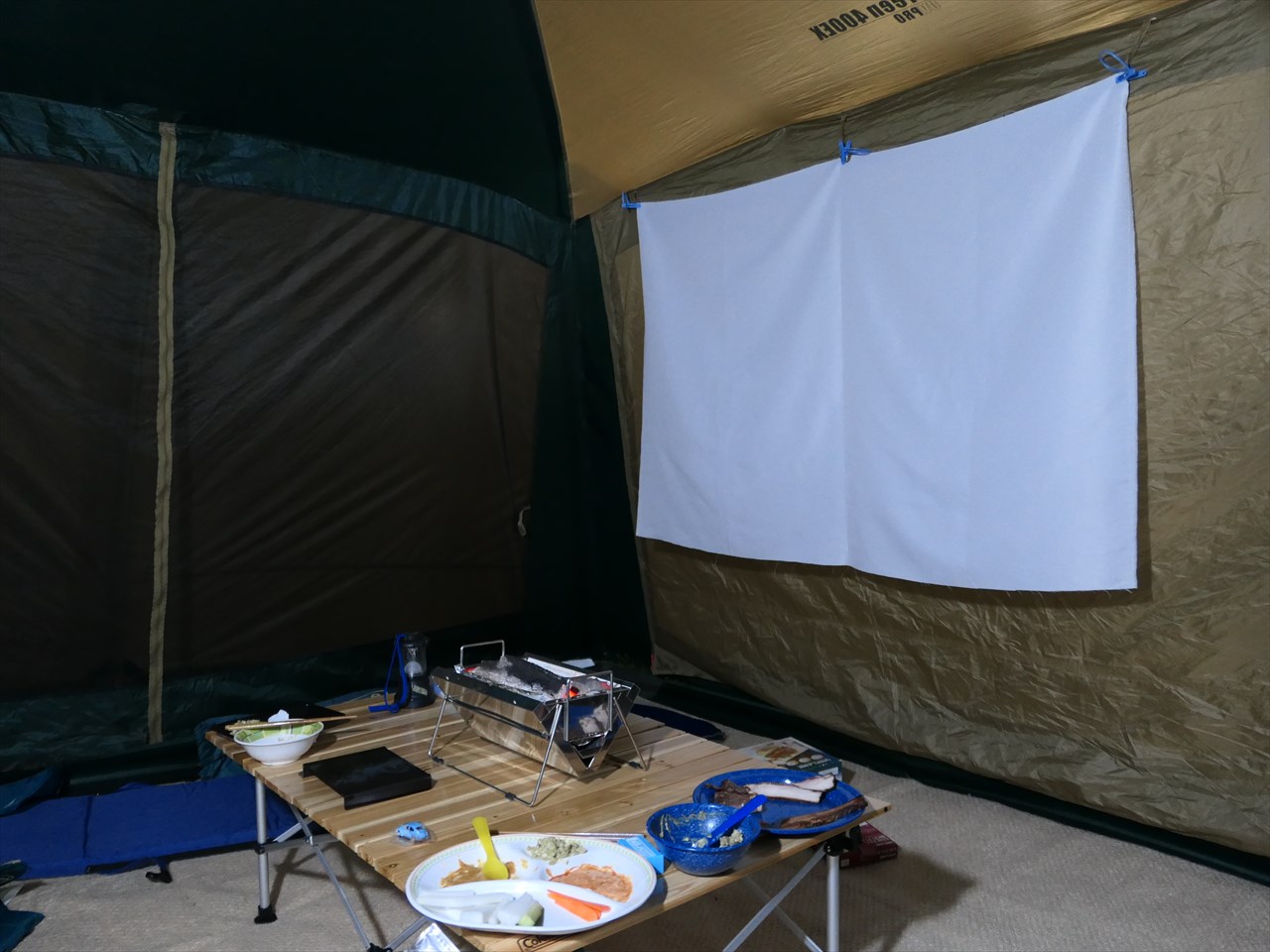 外で炭火バーベキューを楽しんだ後、少し冷えてきたのでスクリーンタープの中に移動することになった。