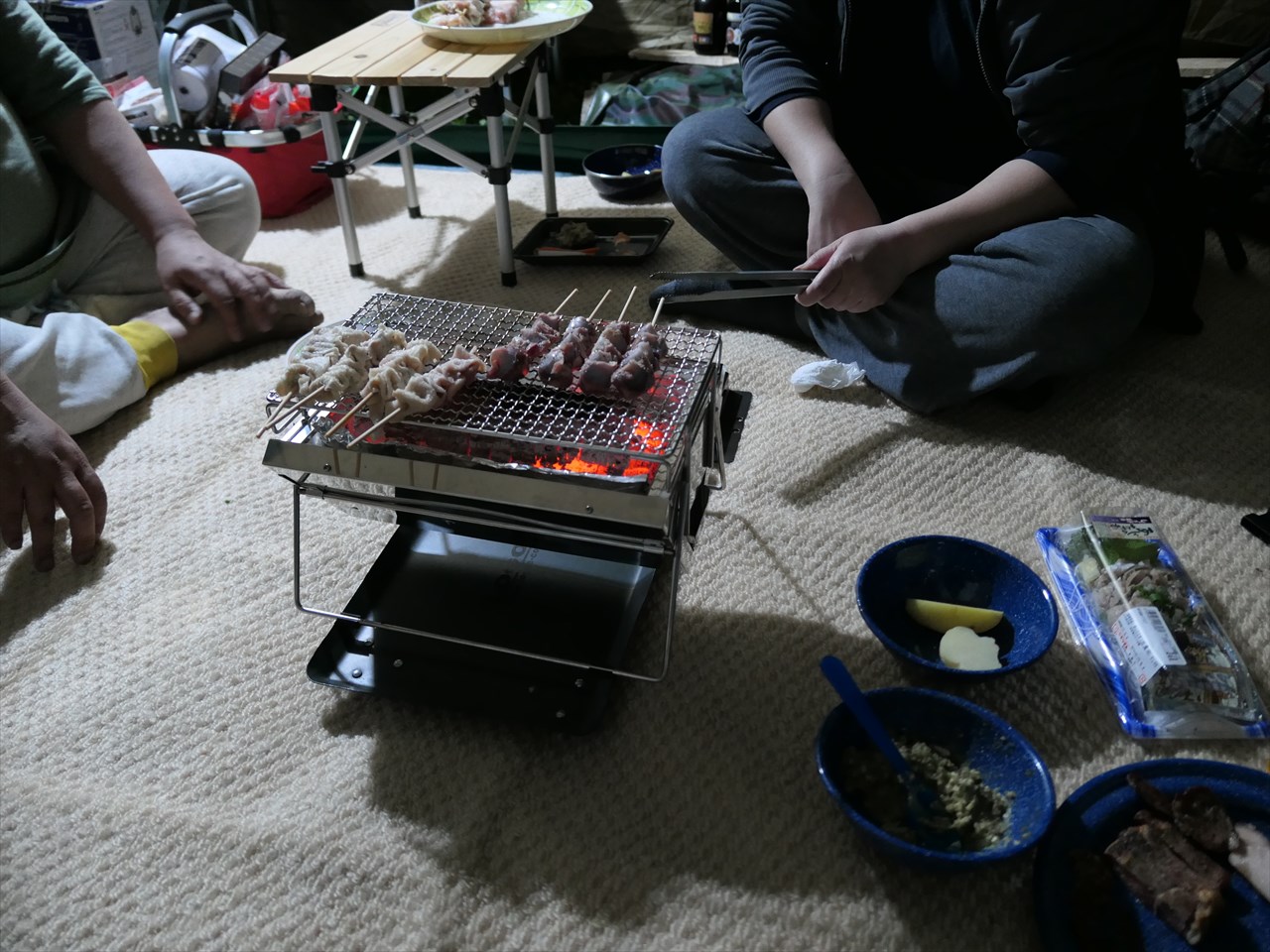 カーペット敷き詰め、まるでリビングのようなタープ内で炭火焼き鳥。