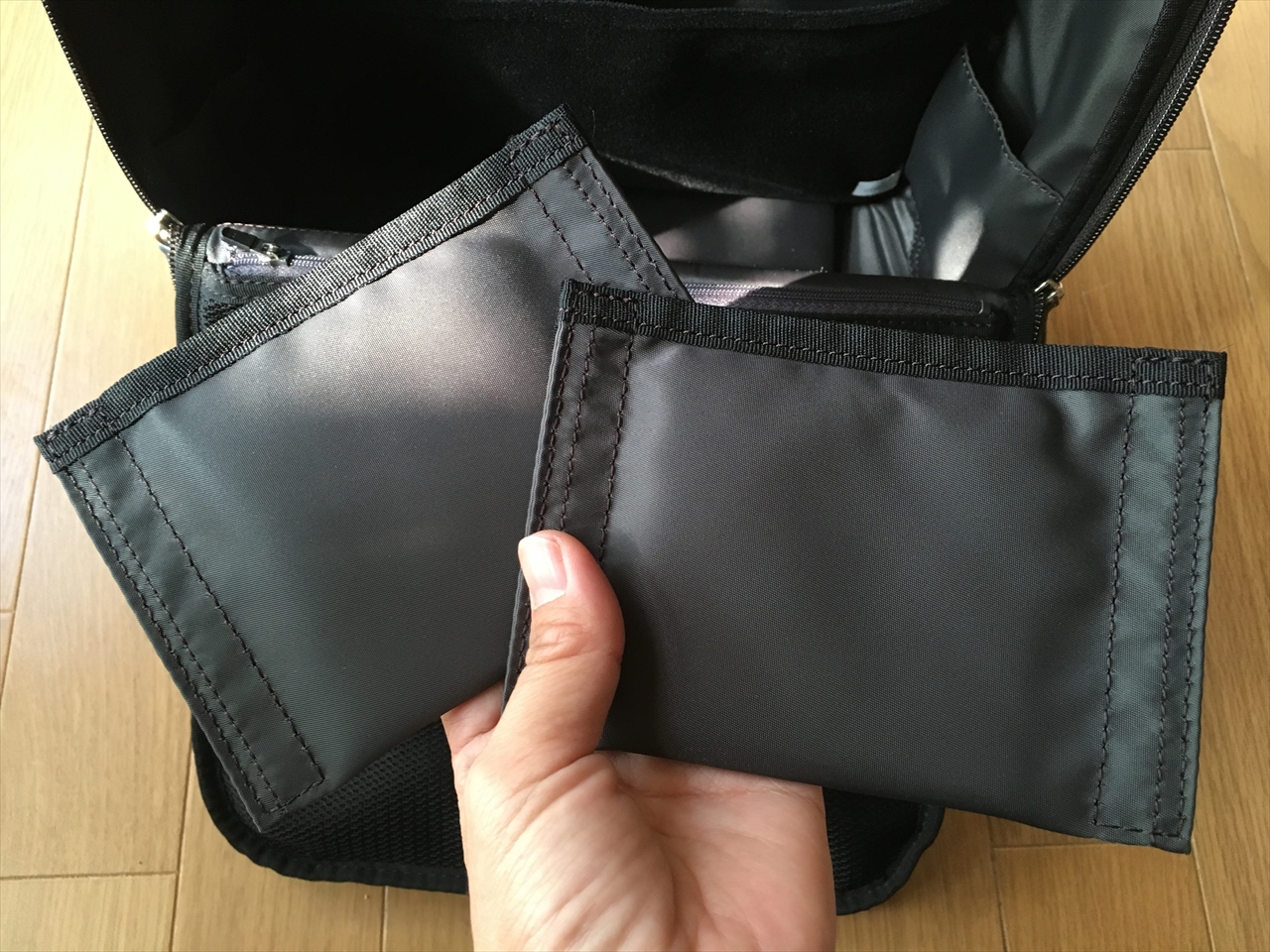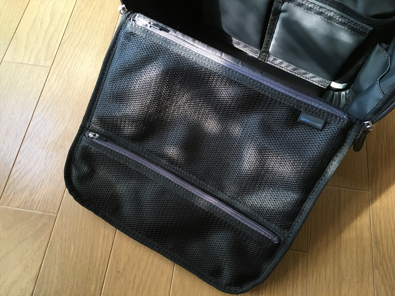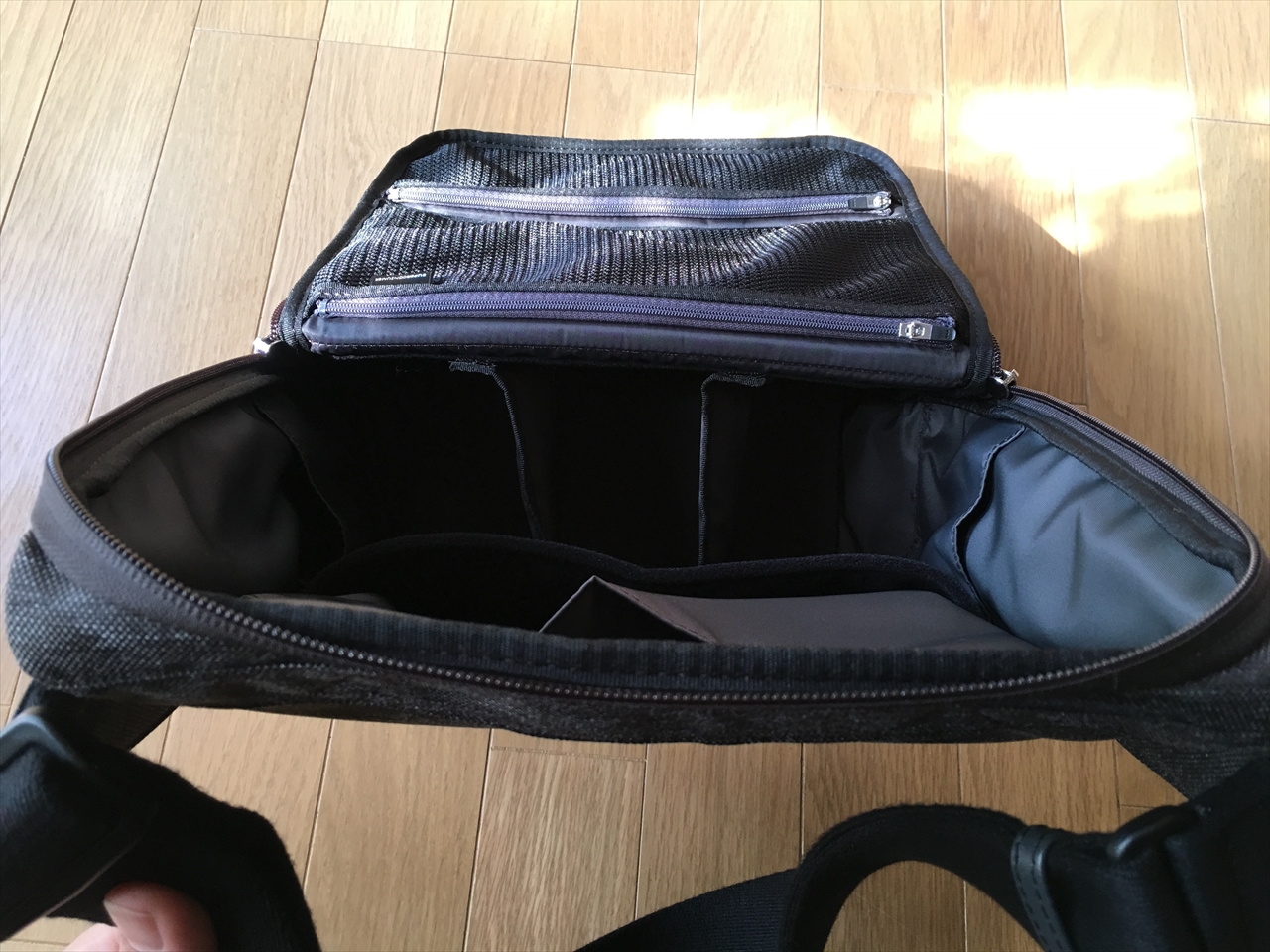 本体の底部分は、マジックテープ付きのこの仕切りで。好きな位置に区切れるようになっているのだが、私は使っていない。どういう使い方してる人が多いのかな。今度観察してみたい。