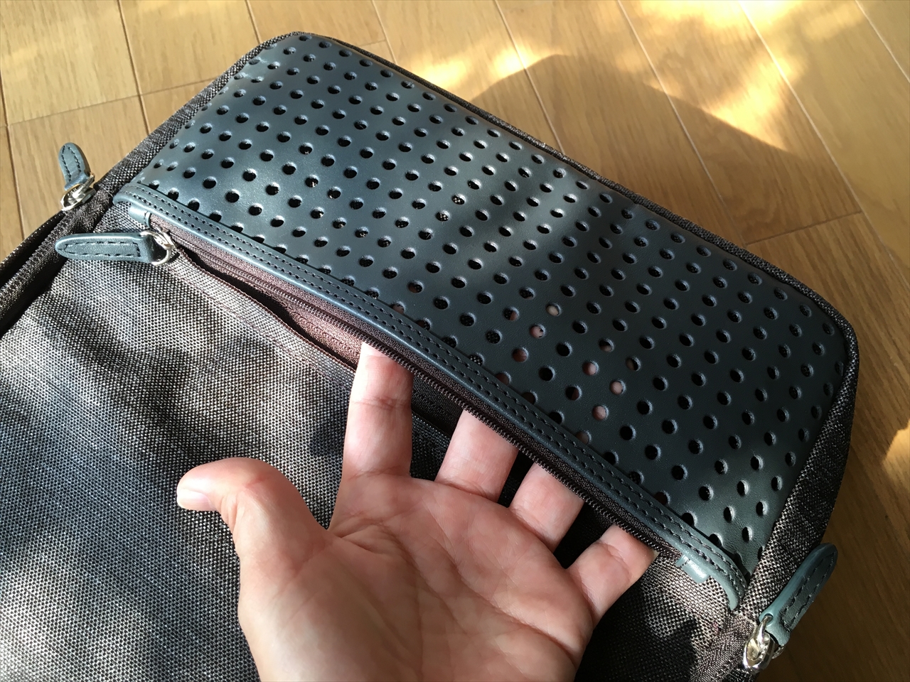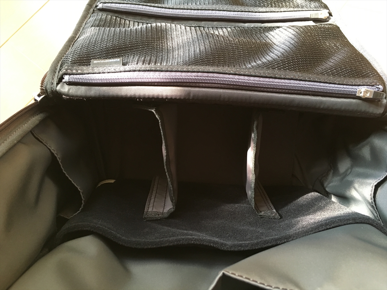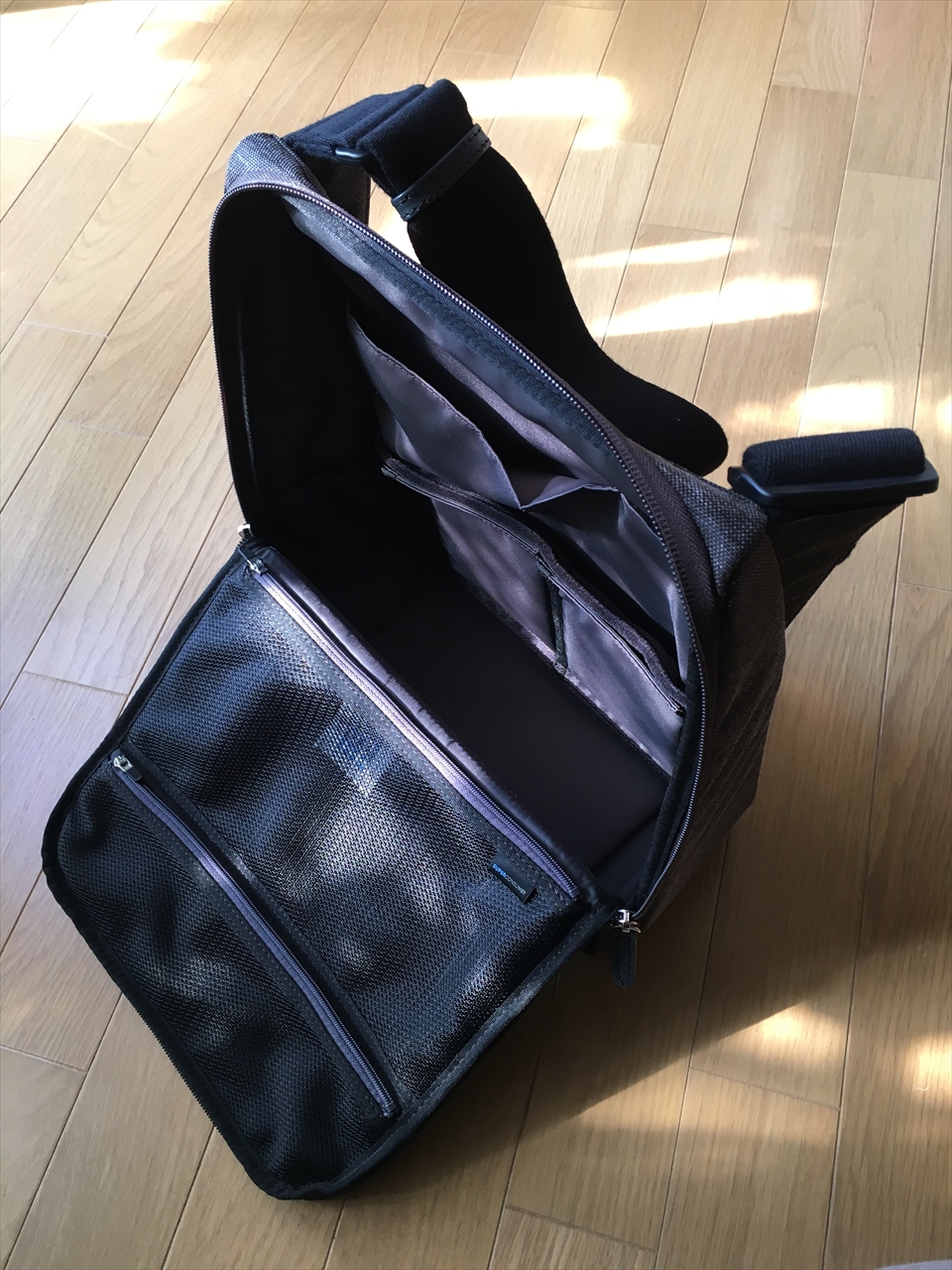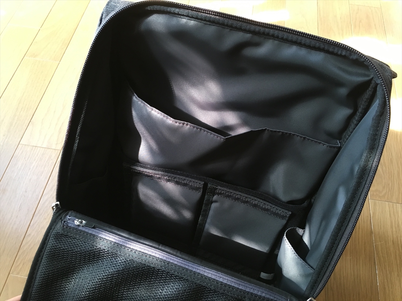 本体の底部分は、マジックテープ付きのこの仕切りで。好きな位置に区切れるようになっているのだが、私は使っていない。どういう使い方してる人が多いのかな。今度観察してみたい。