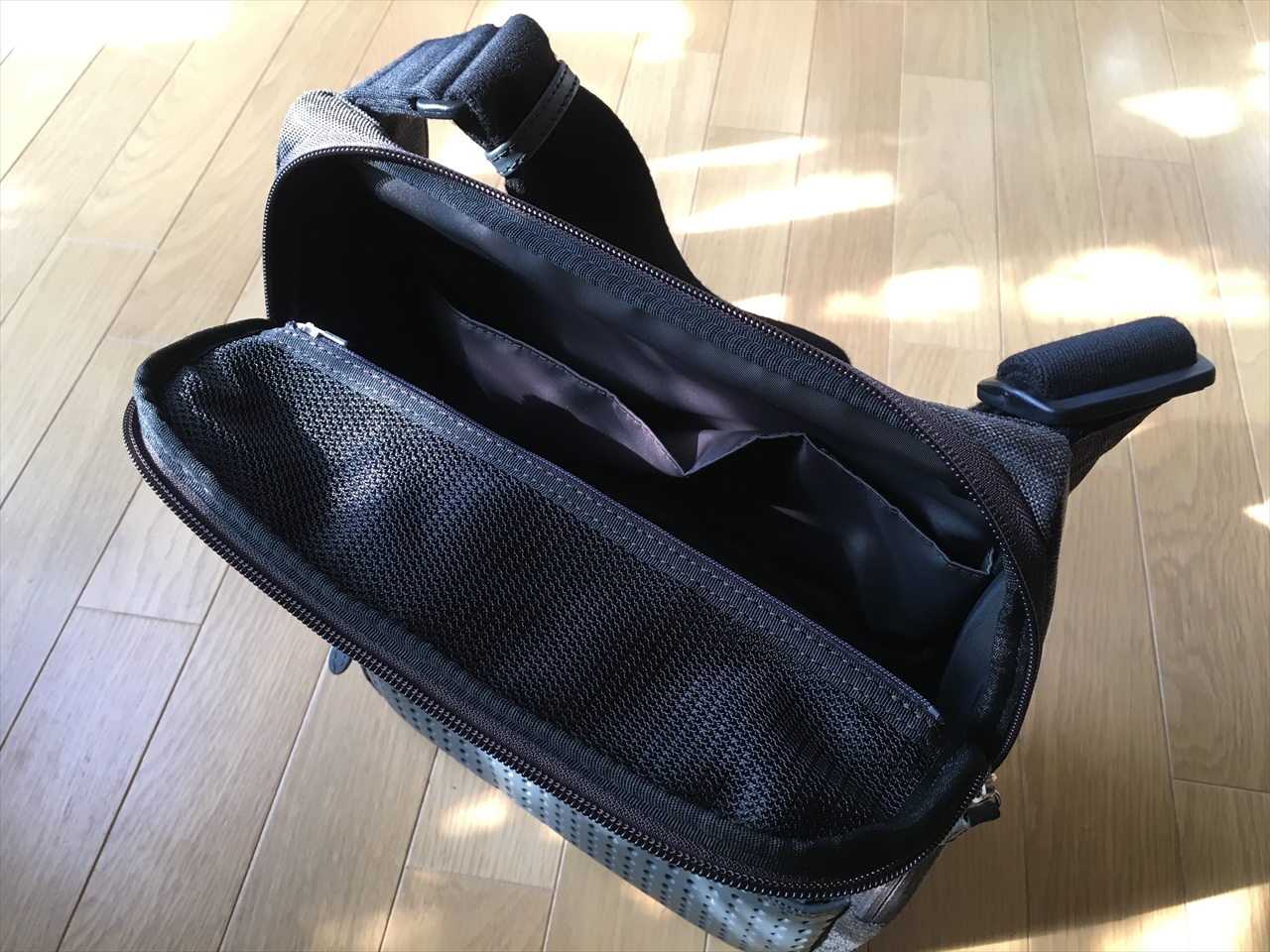 もっと上から見下ろしたの図。バッグを肩からかけたまま見下ろして物を簡単に取り出せるこの作りは本当に秀逸。もちろん中身びっしり入れてしまった場合は全開にすると溢れてしまうが、その場合は一段階折にして中身取り出せばいいだけだ。