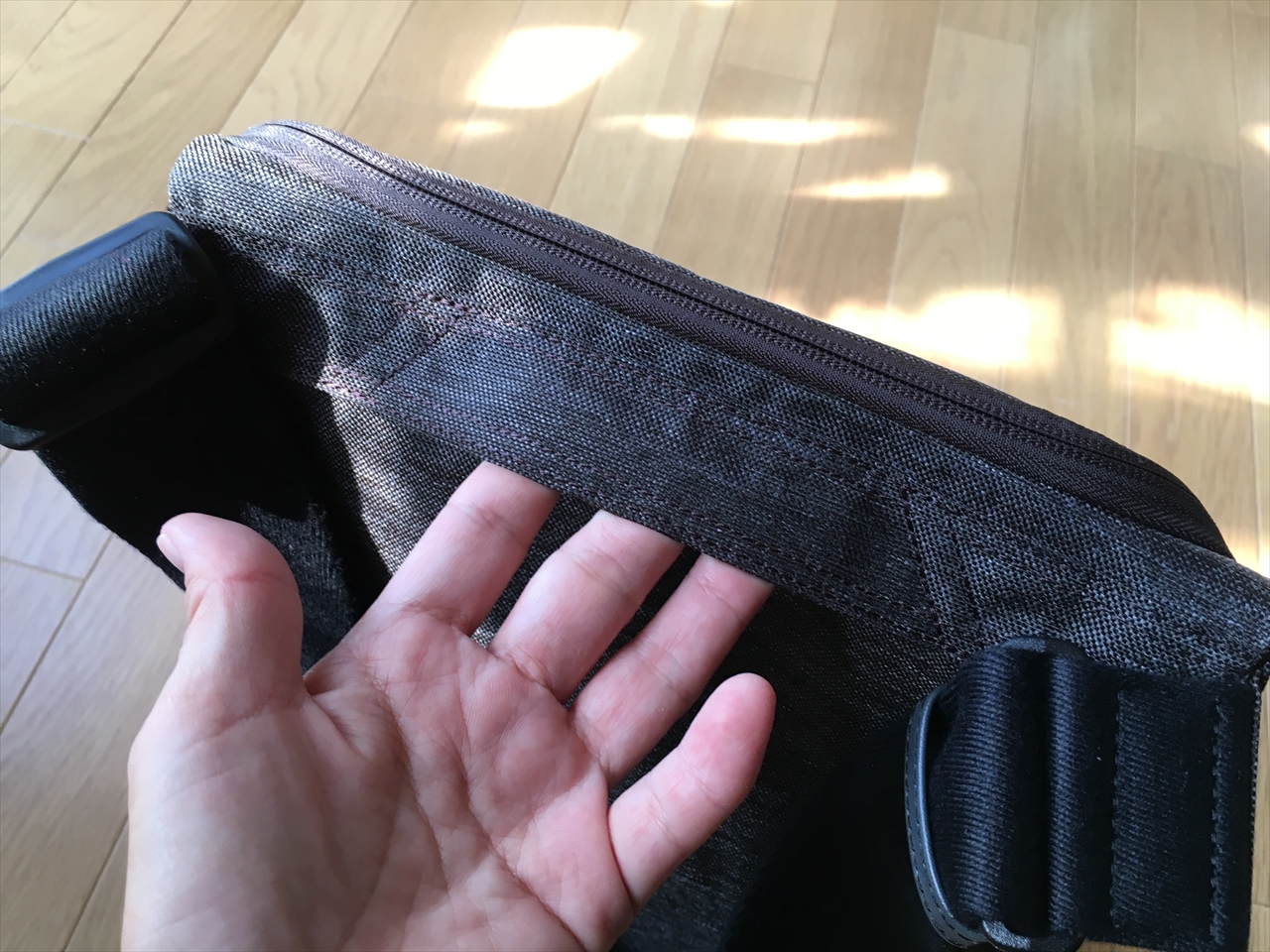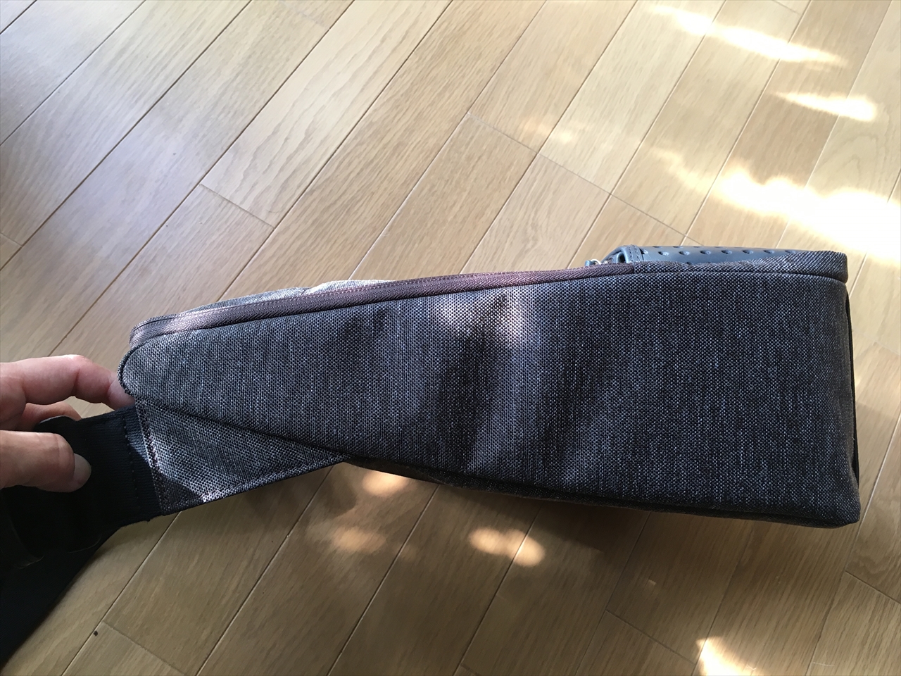 このバッグで非常に気に入ってるところは、実は開くことでも立つことでもなく、くっつくこと。身体にぴたりと付いてゆさゆさしないことだ。