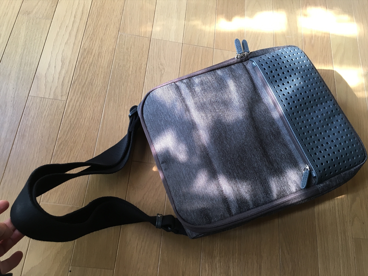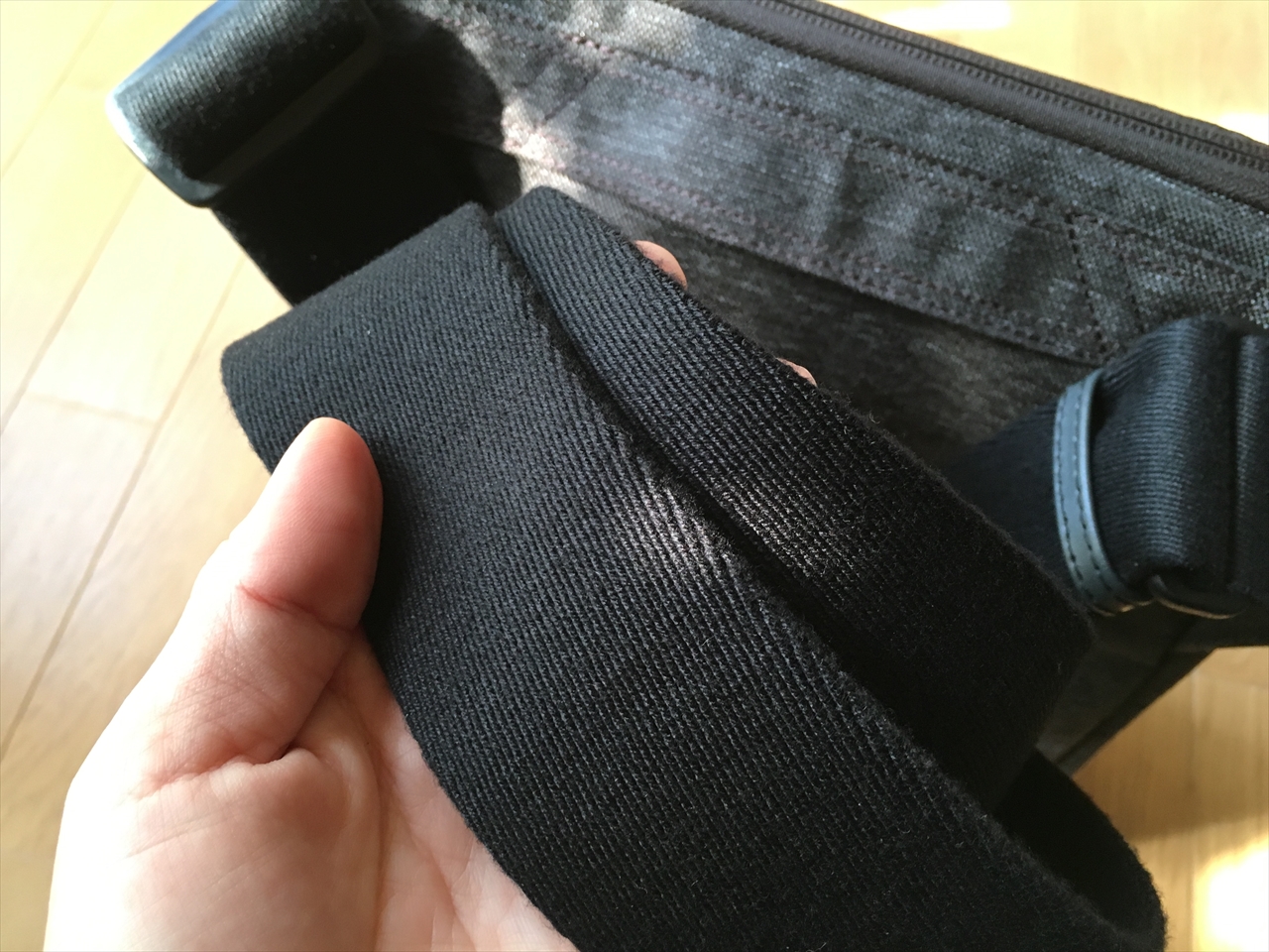 バッグが真下にだけでなく、身体方向にも重心分散する構造だからというのもあるだろうし、太めのショルダー紐の素材と角度もあるのだろう。