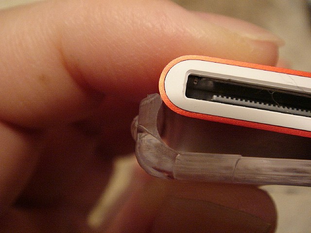 前面と後ろ面のケースをどうやってくっつけるんだろう?と思っていたが、それぞれを本体にかぱっとはめこむ方式。角が丸みを帯びているiPod nanoならではだ。