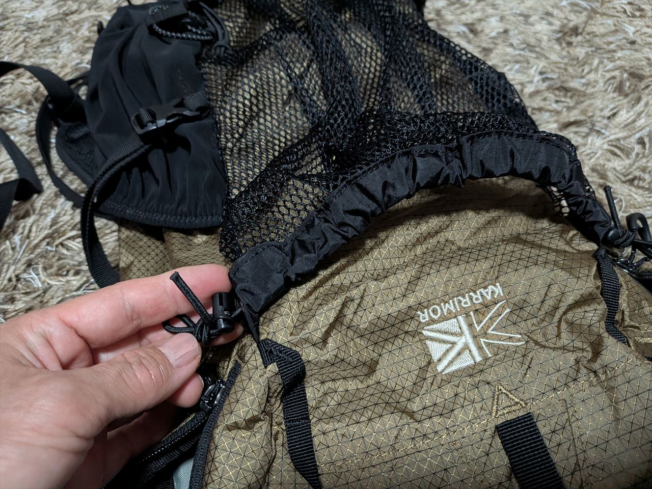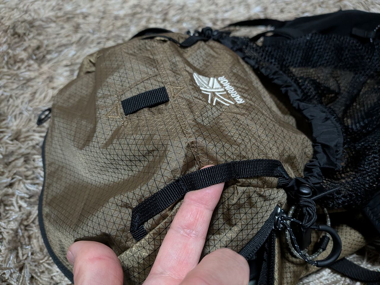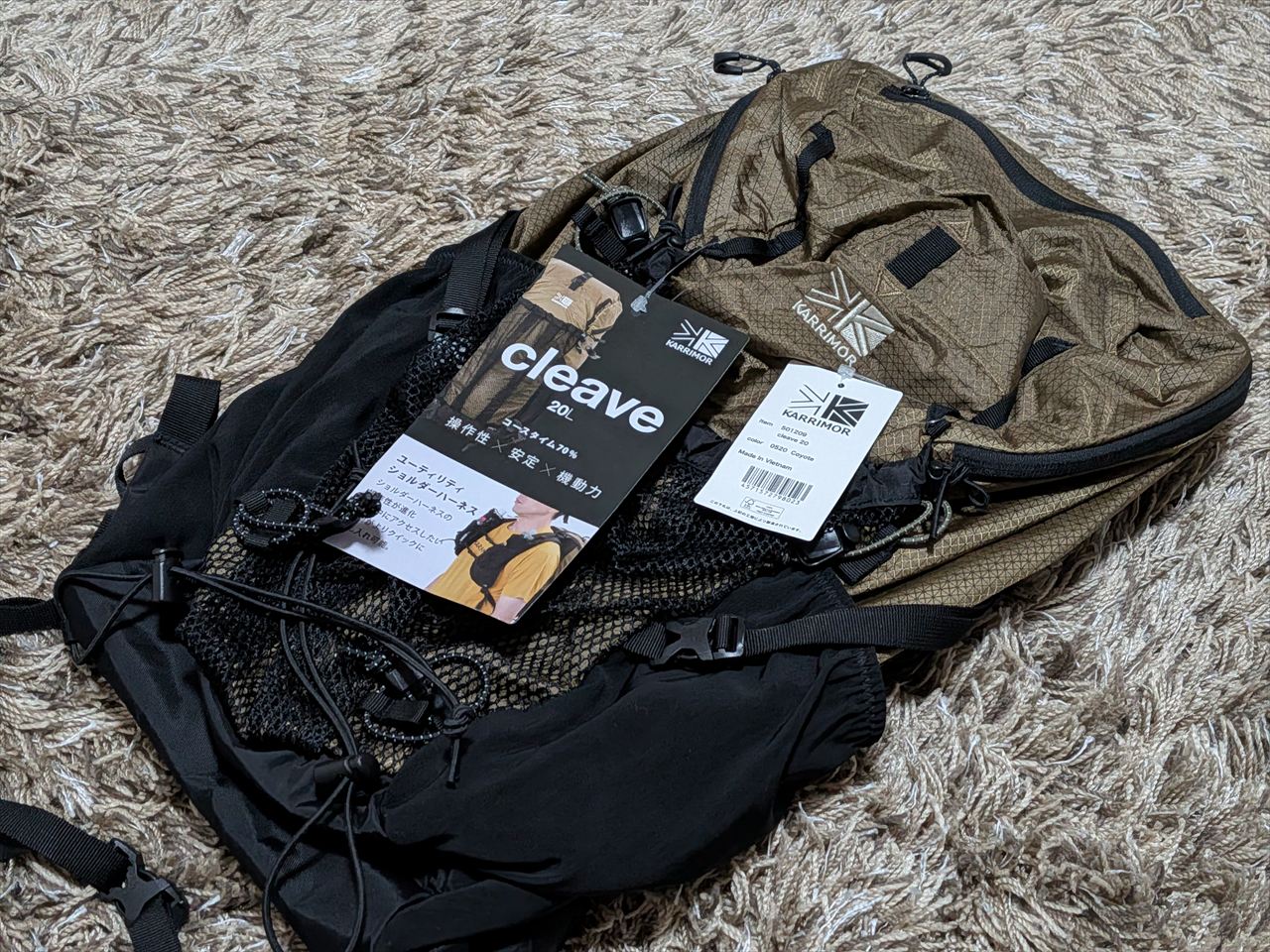 カリマーの超軽量20リットルリュック「クリーブ20(cleave 20)」です。あまりにうれしくて、部屋で背負って一人で鏡見ながらニマニマしている50代のおばさんです。