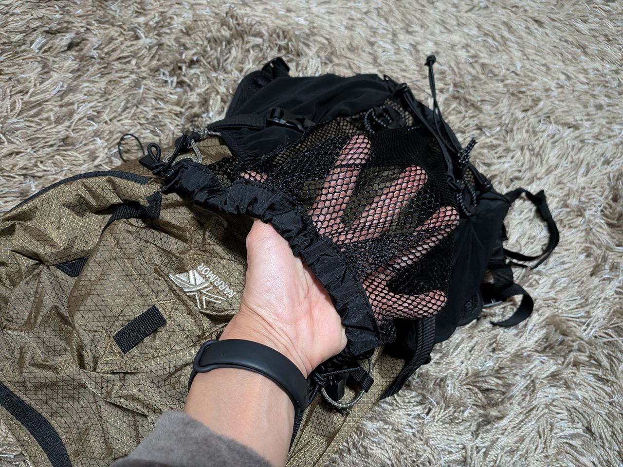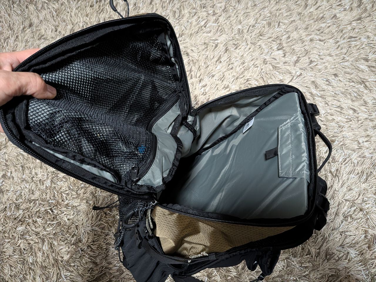 Amazonのレビューには「20Lとは思えないほど容量ある」という評価がいくつも入っていましたが、実際に見て納得です。私もカリマーの25Lリュックを使っていたことがありますが、同等かそれ以上入りそうな気がします。