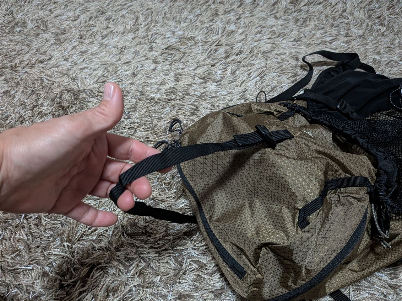 リュックの上にさらに荷物を載せる時のベルト。
