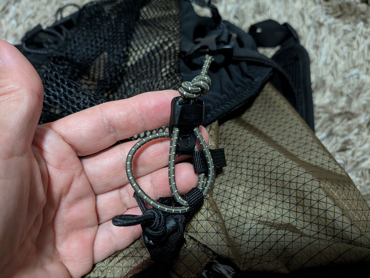 下部にも左右にボトムアタッチメントコードが取り付けられています。ビーチサンダルとかマットとか固定するのによさそう。これも使わない時には外せるのがうれしい。