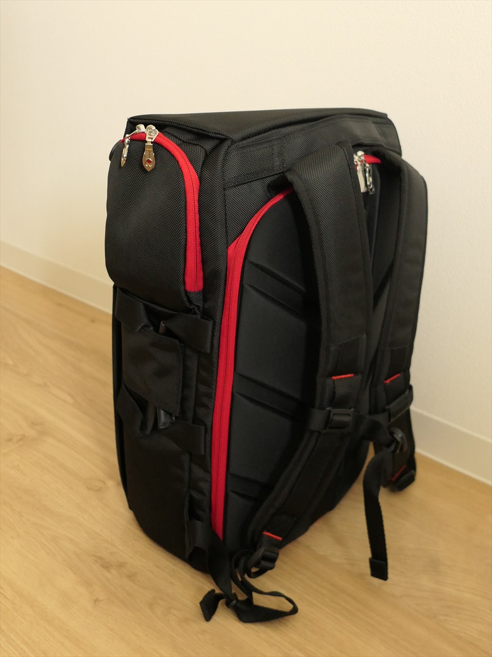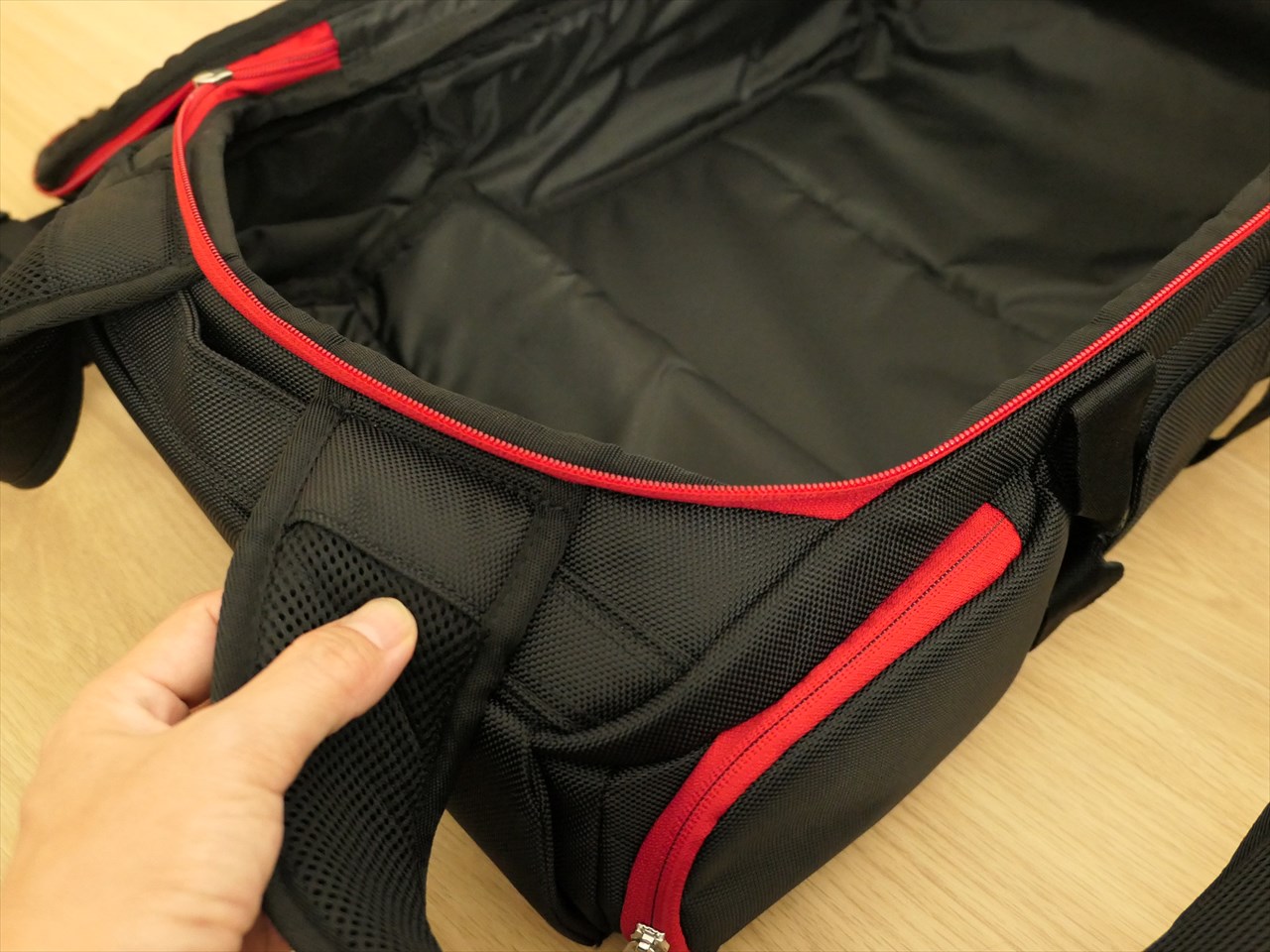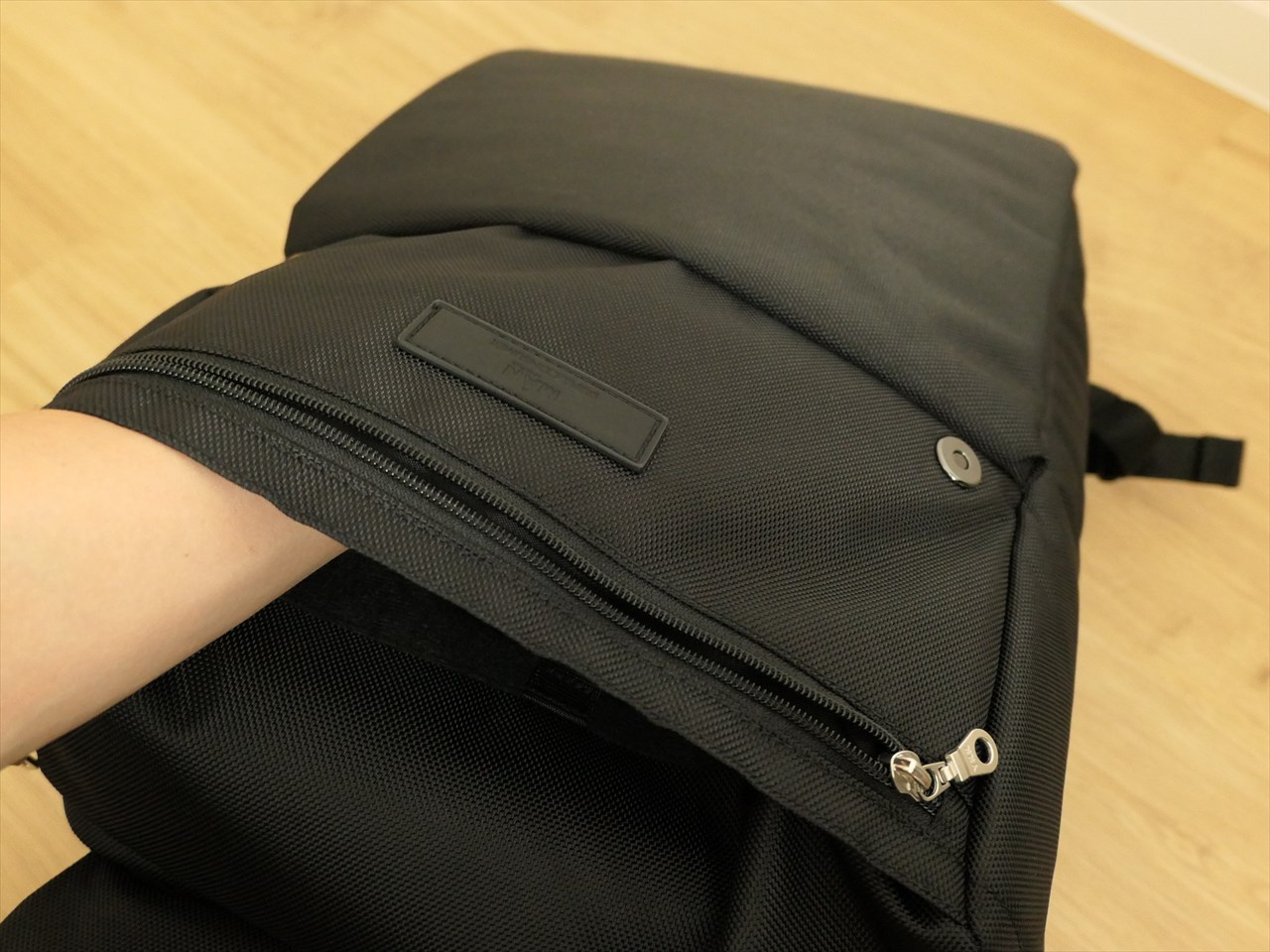 出先で出し入れするものは基本的に、サイドに出し入れ口がある上部収納スペースを使っている。なので背面ファスナーをがばっと開けるのは、目的地に着いた時か自宅、ホテルの部屋などでだ。