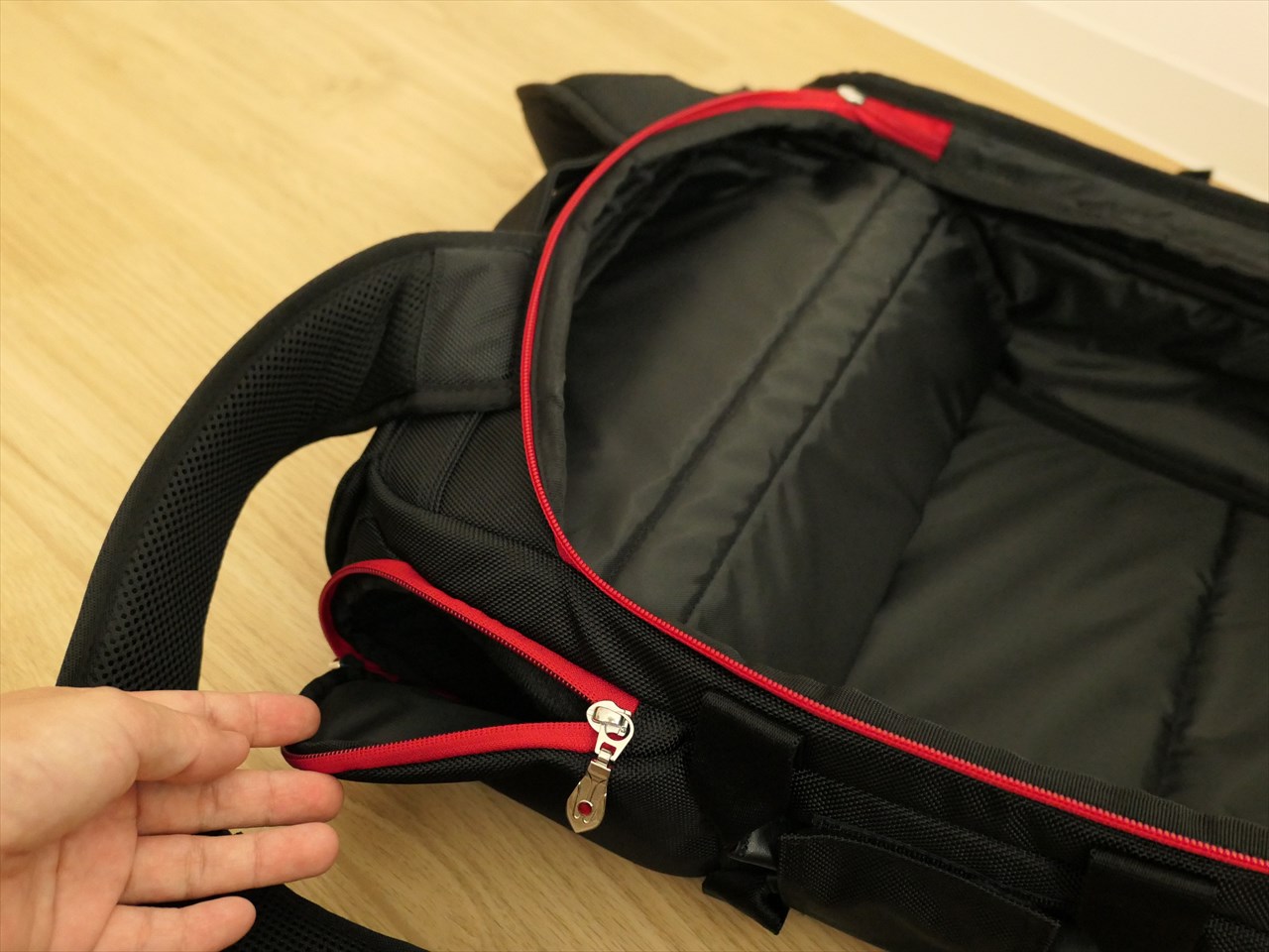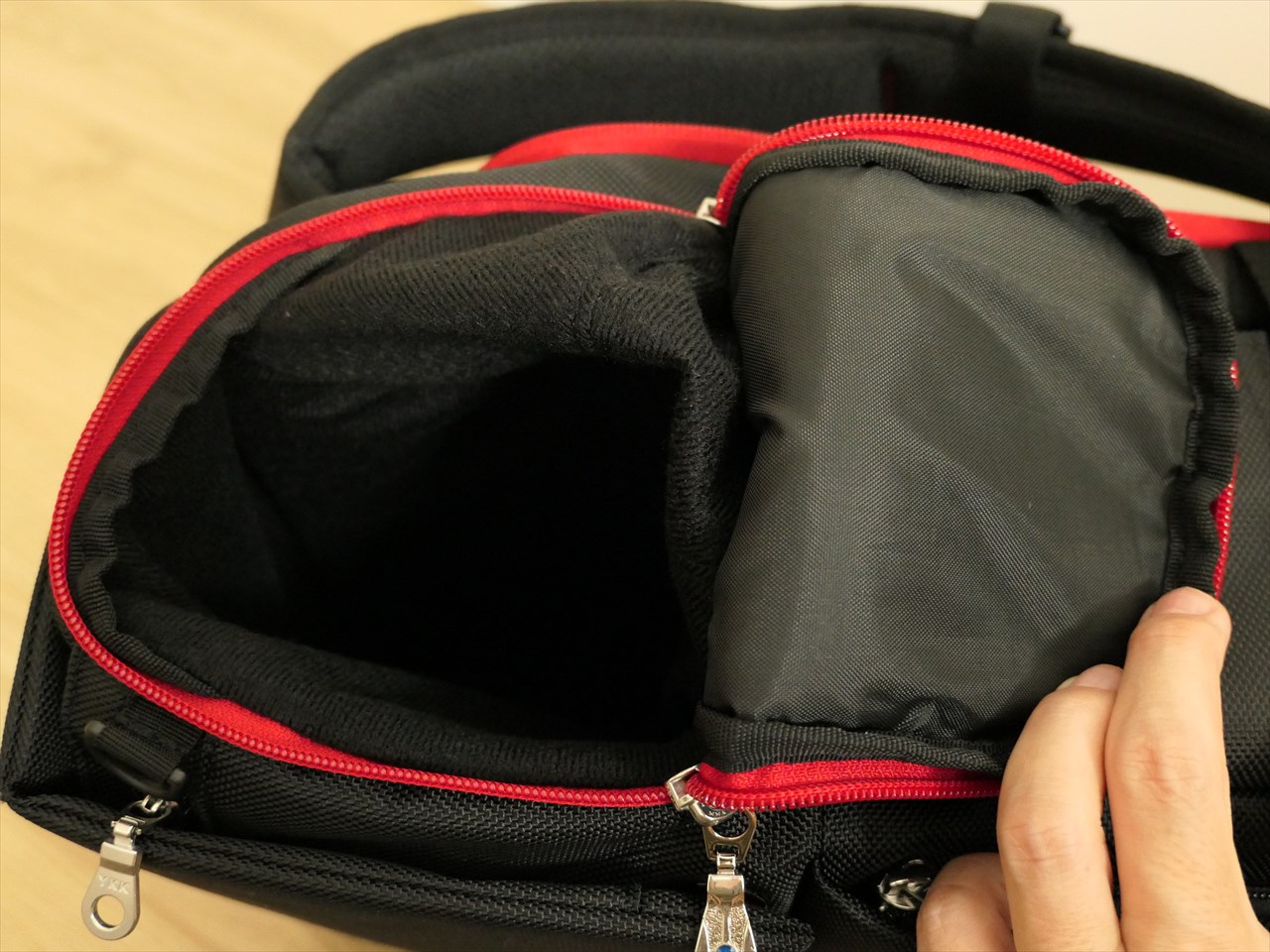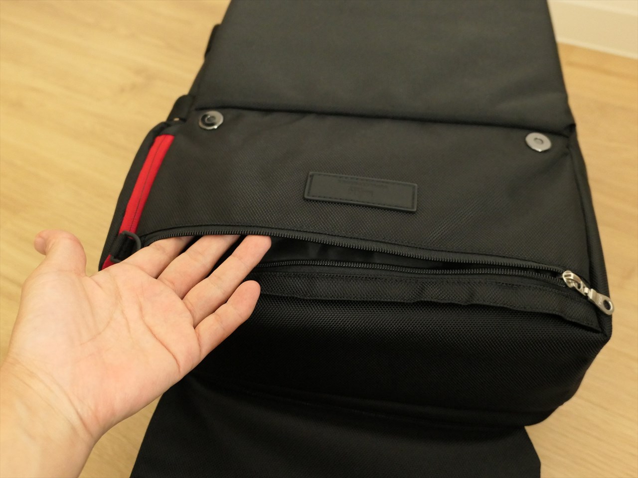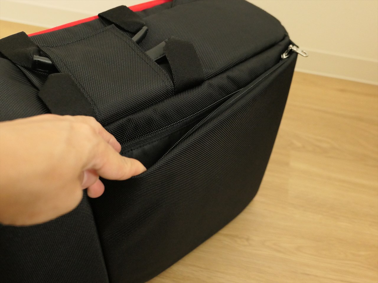 上の写真で見た時に、赤い縁取りになっているのが出し入れ口のファスナーだ。
