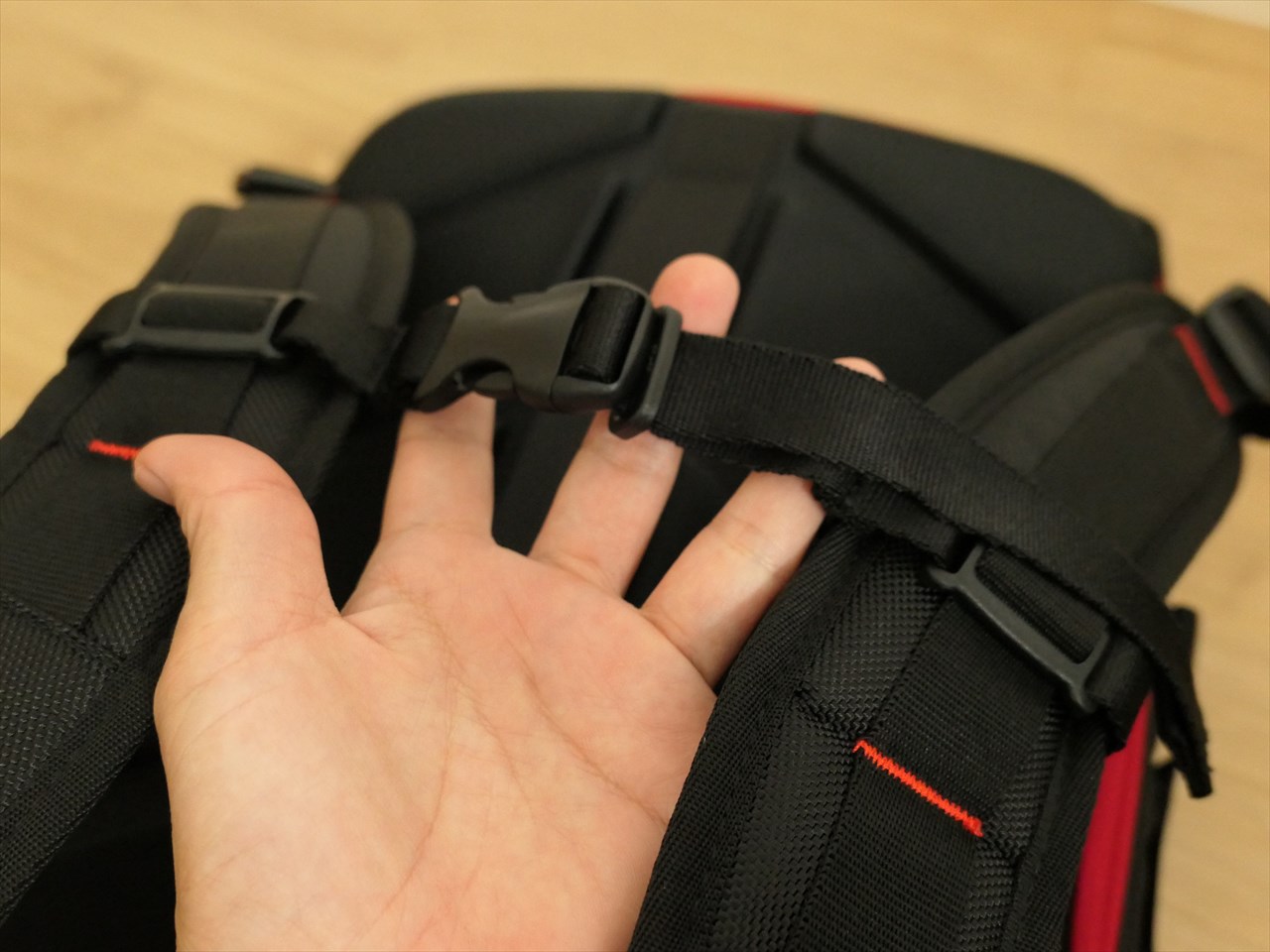 さっき「ウエストベルトはついていない」と書いたが、チェストベルトはちゃんとついてる。細いものだが、これがあると安定感はかなり変わる。