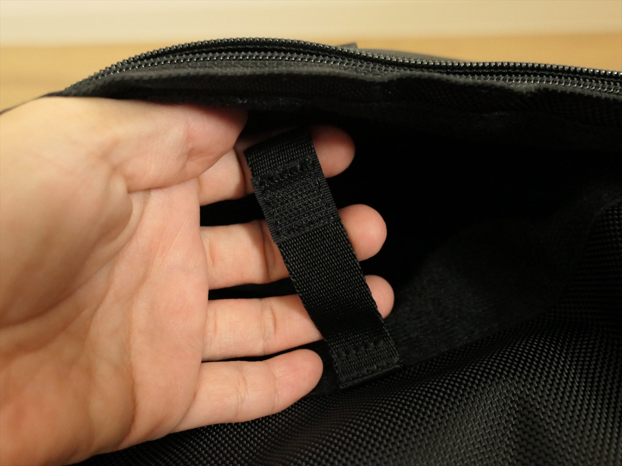 なんかに本当に重宝するのが、上部背中側にさりげなくつけられたこのベルト。