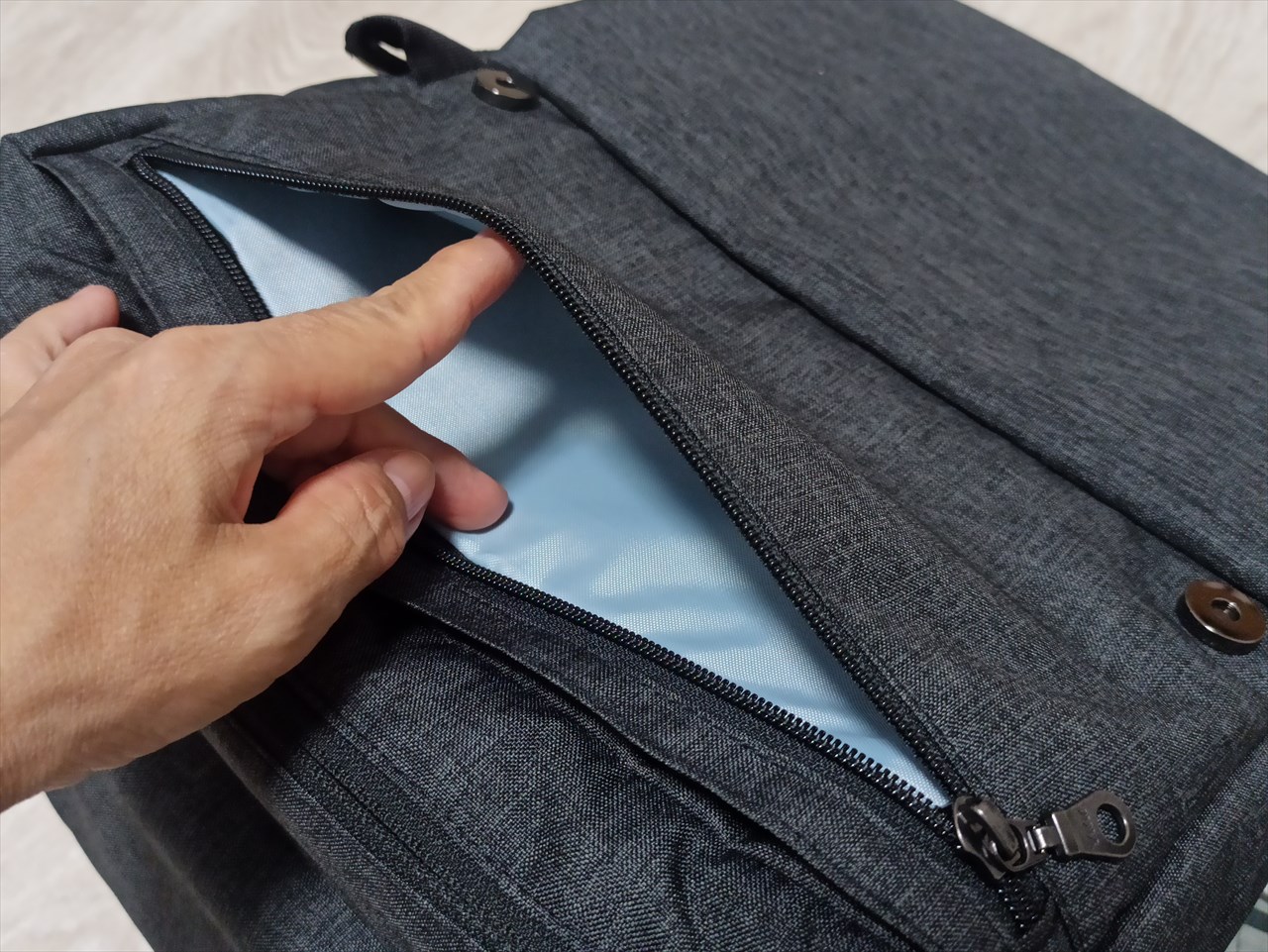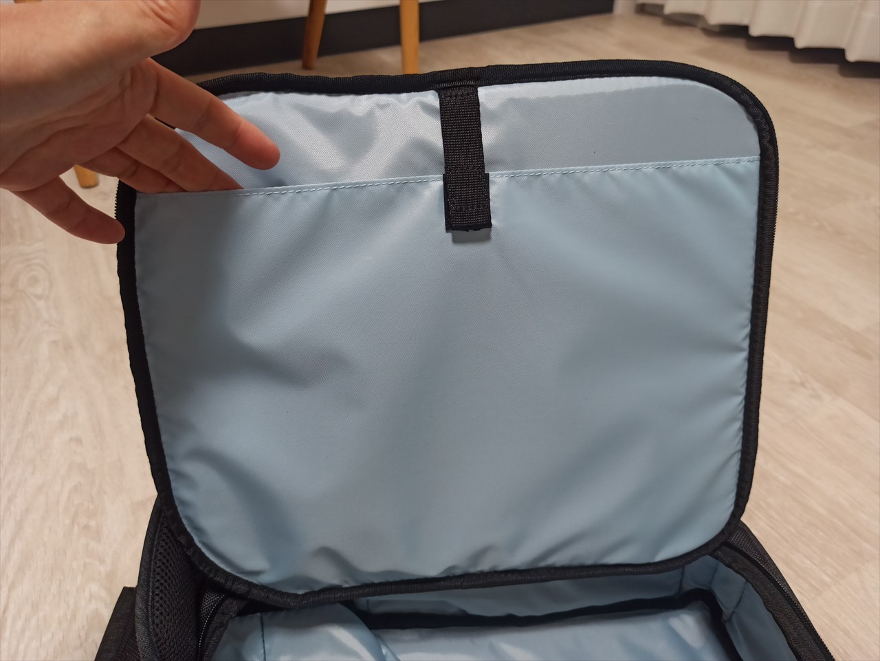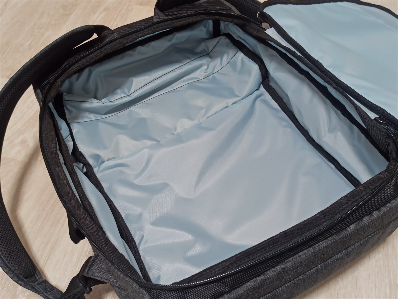 ここへのアクセスはバッグ上部から。ぺらり蓋をめくるとファスナーが現れ、開けるとこんな感じ。